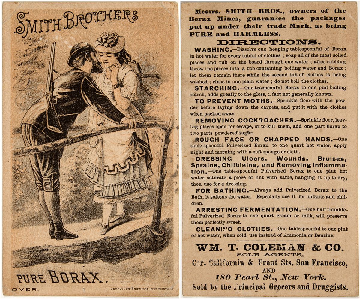 c1900 This is a 4.5"x 2.5" advertising card for Borax from the Smith Brothers. Francis Marion (Borax) Smith began developing borax deposits in Nevada and California in the 1860s. This product was one of their first, distributed by Wm Coleman, a major player in the Gold Rush (shipping, etc) and was on the 1856 Vigilance committee. Lynn Langdon Collection - HKA#65685