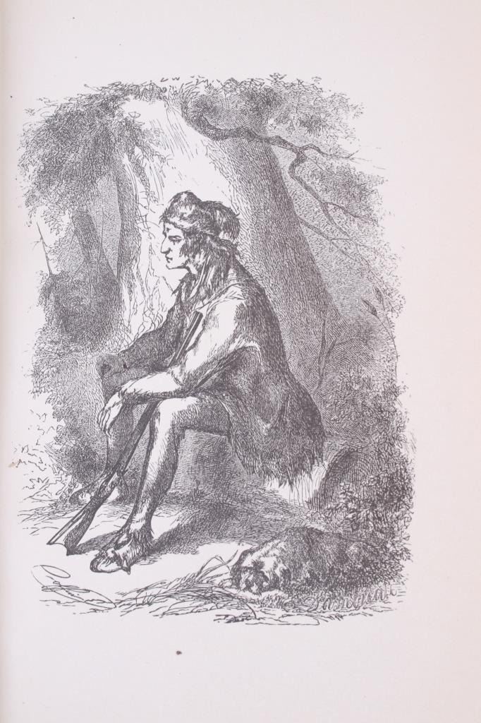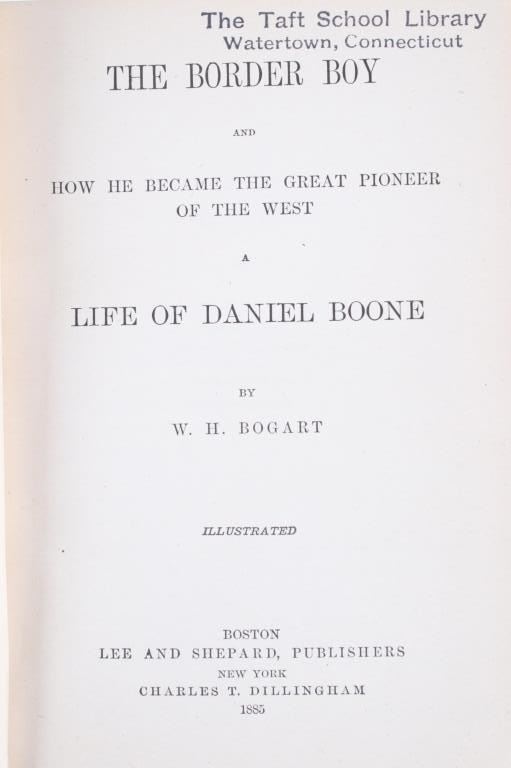 For your consideration in this lot we have a second edition copy of "Border Boy and How He Became The Great Pioneer of the West A Life of Daniel Boone" by W. H. Bogart. The book was printed in 1885 by Lee and Shepard, Publishers and copyrighted in 1884. William Henery Bogart (1810- 1888) was a New York lawyer, journalist, author, and historian. He is best known for "Daniel Boone and The Hunters of Kentucky" which he wrote to try and preserve the history of Boone rather than be lost to folk stories. This book focuses on Boones early life, exploration, and military career throughout his life. The book, much like The Hunters of Kentucky, tries to preserve the history of Boone rather than the exaggerated folk stories. The piece features numerous illustrations depicting Boone in his adventures. The book displays a dark blue and gilt gold cover with pressed black designs. The piece shows good condition overall with some light wear on the cover of the spine. The book measures 7" tall by 5 1/4" wide and 1" thick.