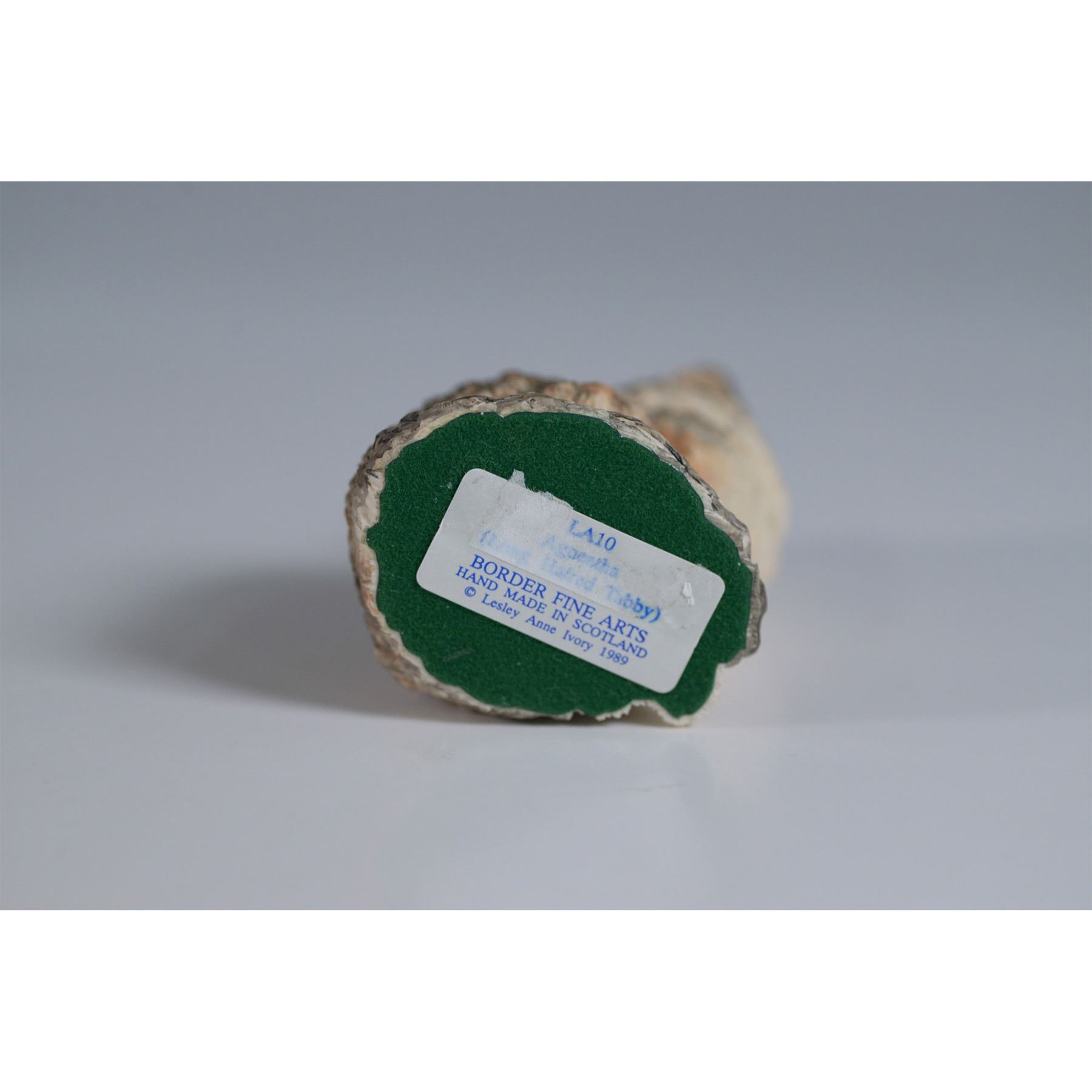 Border Fine Arts hand-painted figurine titled Agneatha, featuring a long-haired tabby cat with intricate detailing and lifelike coloration. Designed by Lesley Anne Ivory and released in 1989, this charming piece showcases the fine craftsmanship of Border Fine Arts, known for their high-quality animal sculptures made in Scotland. The underside bears the original label with the model number LA10. This item has its original box.