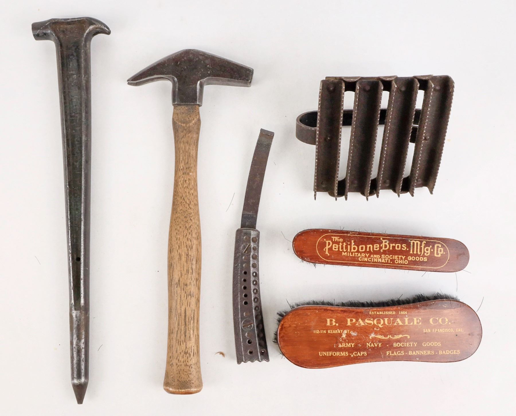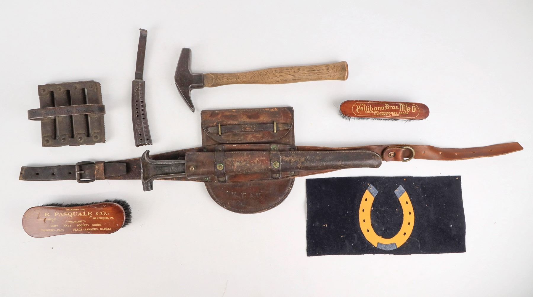These horse grooming tools were issued to the 17th Cavalry Regiment from Maryland, during the Pancho Villa Expedition border wars with Mexico and into WW1. They were expecting to leave for France put was upheld when the armistice was signed ending that war. The kit includes a hoof knife, curry comb, shoe puller, two brushes for soldier grooming, furrier hammer and leather carry case marked: "MD/17 CAV/26", and a felt cavalry armband. Please see photo for details.