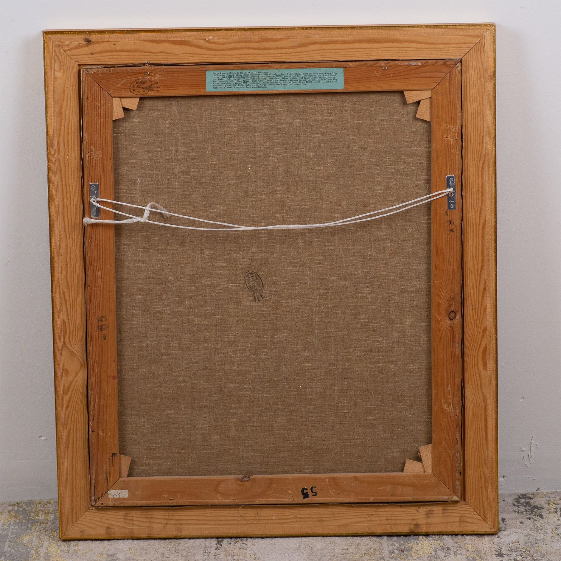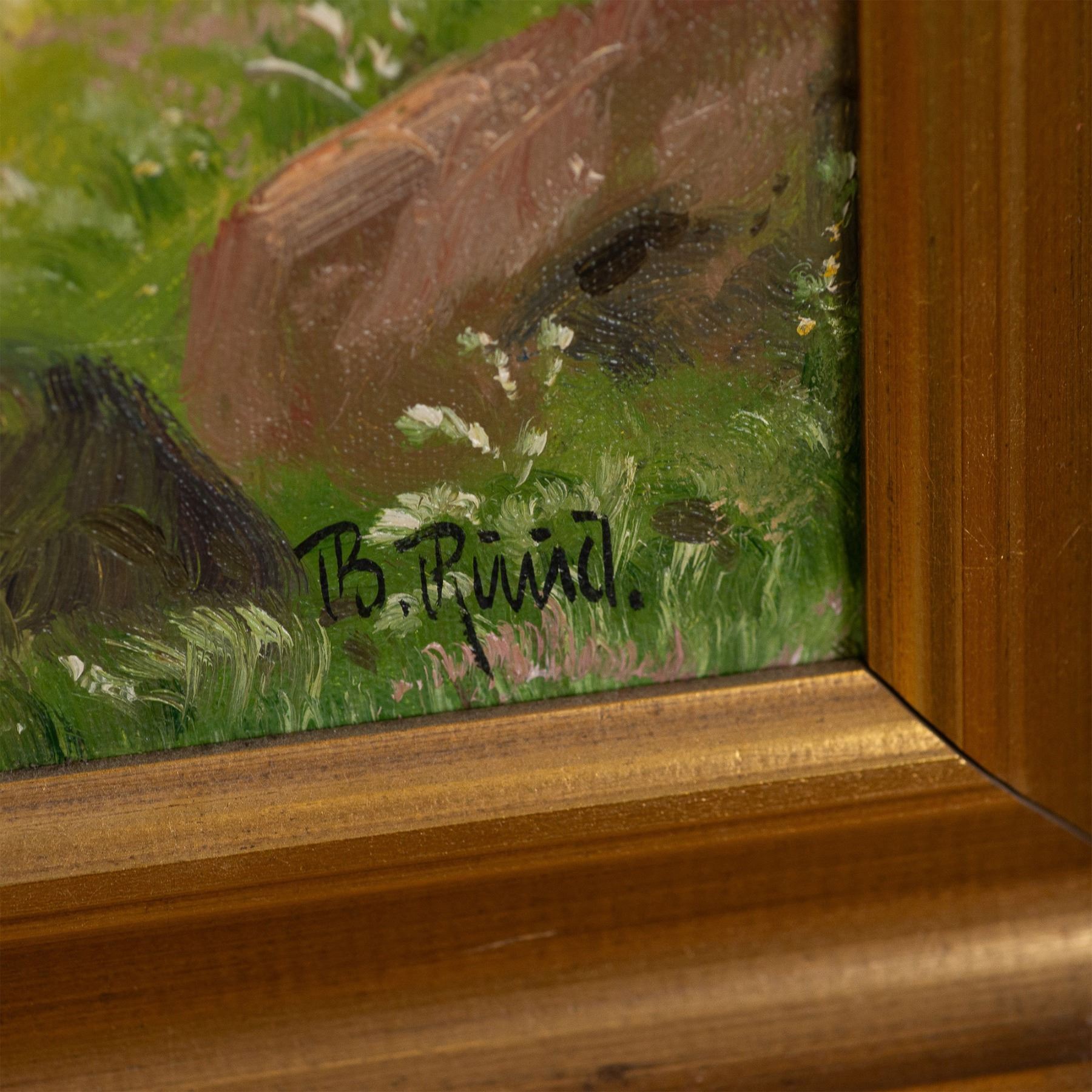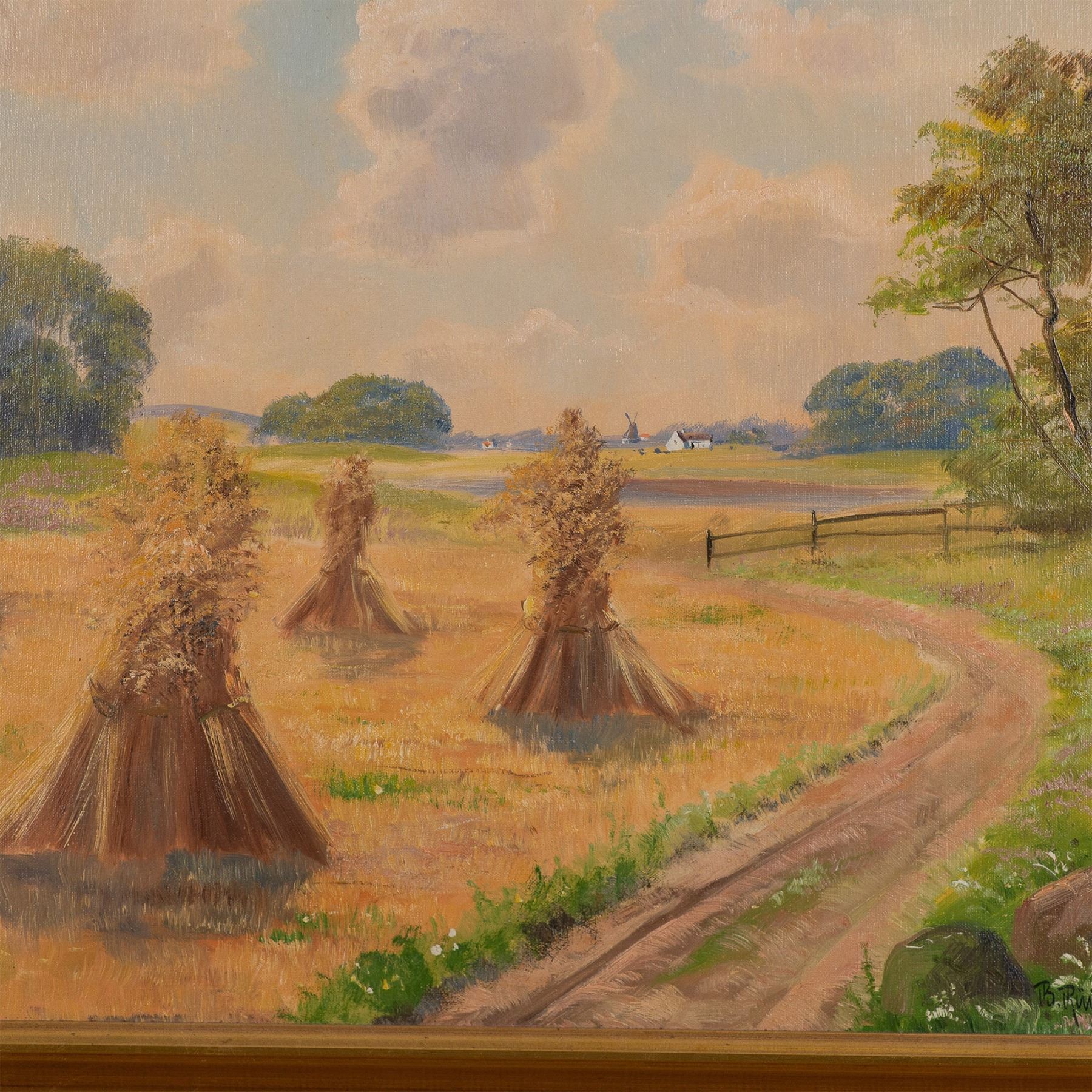 This picturesque oil on canvas painting, signed by Norwegian artist Borge Ruud, features a tranquil rural landscape filled with haystacks set against a bright, serene sky. The composition showcases Ruud's skillful use of color and light, emphasizing the golden tones of the field in harmony with soft blues and greens in the background. The detailed rendering of the countryside, with its winding path and distant structures, reflects a deep appreciation for pastoral life and a commitment to realism. Borge Ruud was a celebrated Norwegian artist known for his evocative landscapes and dedication to capturing the natural beauty of his surroundings. Ruud's works are often infused with a sense of nostalgia, reflecting the agrarian lifestyle and serene environments of his homeland. He was highly regarded for his ability to depict light and atmosphere, creating compositions that resonate with both simplicity and depth. His art is featured in numerous private and public collections, earning him recognition as one of Norway's notable 20th-century landscape painters. Signature on lower right: B. Ruud. Housed in a gilded frame. On verso: biographical information on Borge Ruud including education and exhibitions. Artwork dimensions: 21"L x 25"H. Frame dimensions: 26"L x 30"H x 1.75"W.