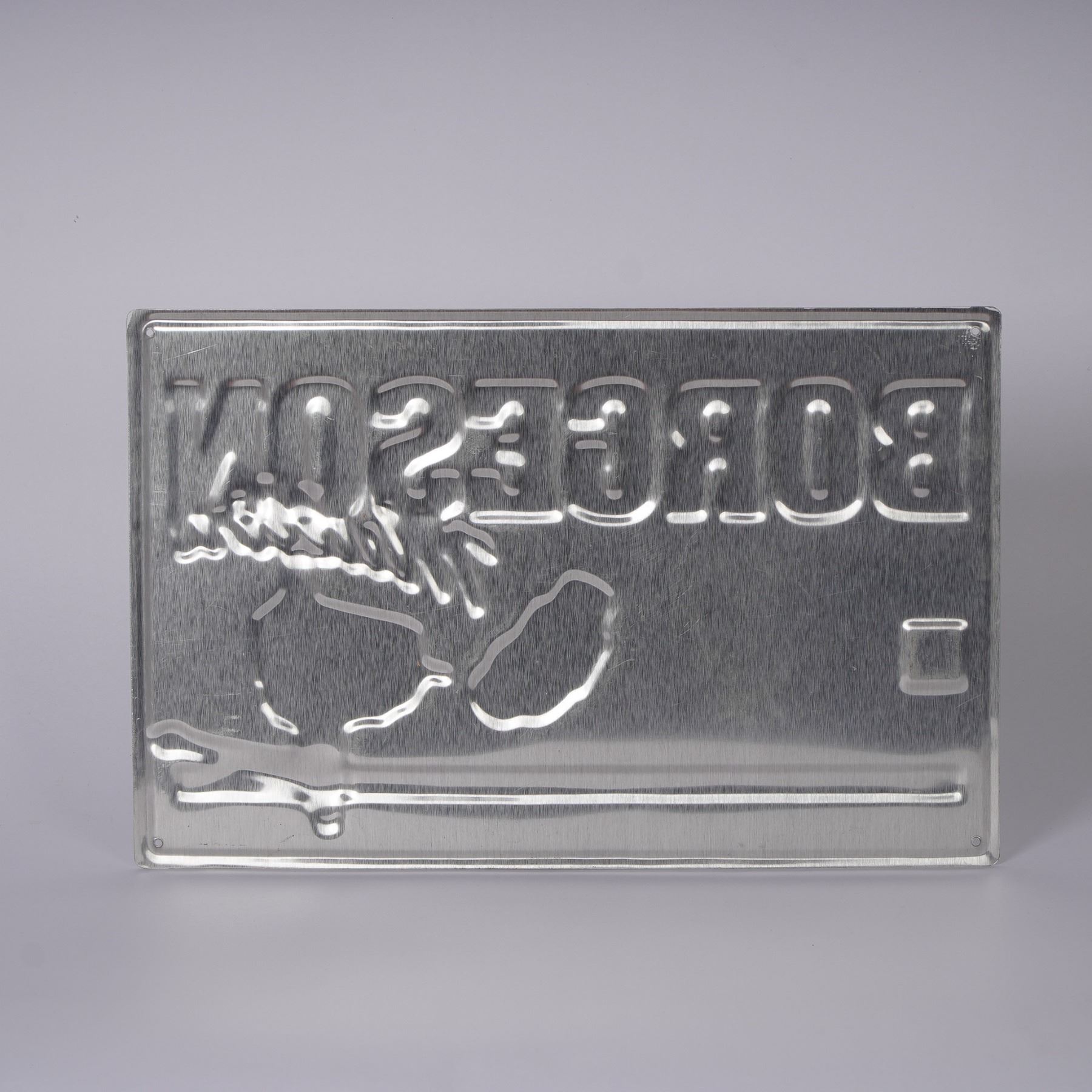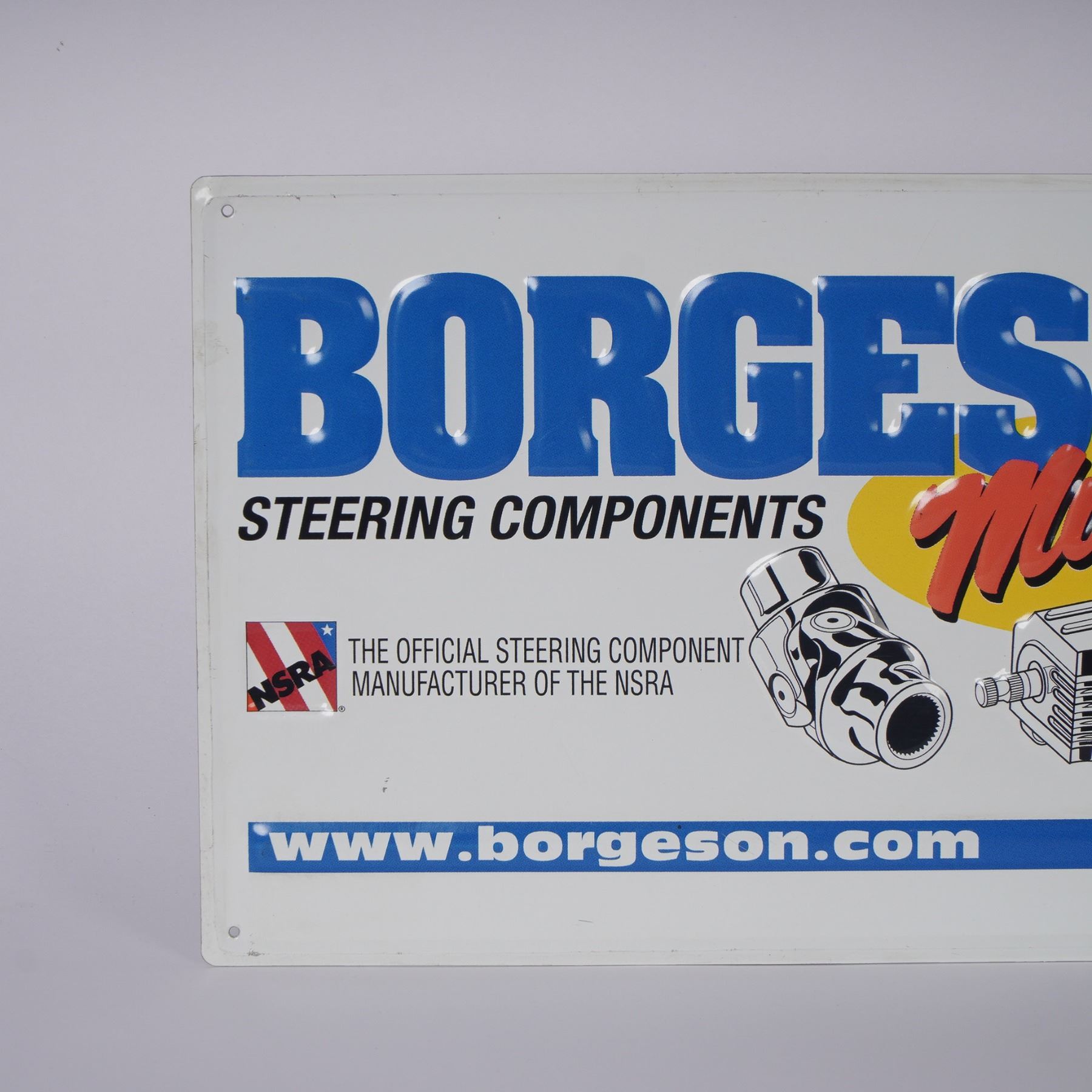Embossed metal advertising sign for Borgeson Mullins Steering Components, featuring bold blue and red graphics with a detailed illustration of automotive steering components. The sign notes Borgeson as the official steering component manufacturer of the National Street Rod Association (NSRA) and includes their website address. Produced by Roadside Relics & Restorations in 2006, the reverse is unpainted metal with the embossed design visible in relief. Hangs via four pre-drilled corner holes. A vibrant piece of automotive nostalgia ideal for a garage, man cave, or collector wall.