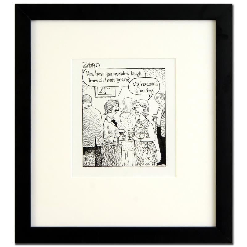 Enter a surreal and satirical world of twisted imagination and award winning creativity. "Boring Hubby" is an original pen & ink drawing on paper by Dan Piraro, creator of the critically acclaimed and award winning comic strip, Bizarro! This piece is hand signed and comes framed. Includes Certificate of Authenticity! Measures approx. 13" x 14" (with frame), 6" x 7" (image). ** Please note: there is minor wear to the corners of the frame. **