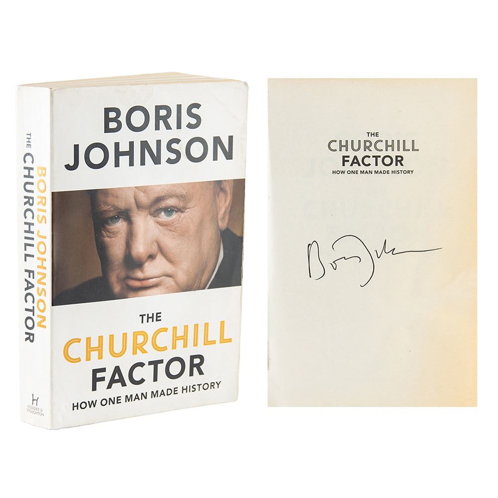 Signed book: The Churchill Factor. First edition. London: Hodder and Stoughton, 2014. Softcover, 6 x 9.25, 408 pages. Signed on the half-title page in black ink by Boris Johnson. In very good to fine condition, with creasing to the spine, soiling to the covers, and edge toning to the signed page.