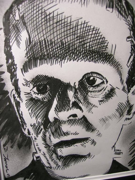 Drawing of Frankenstein's Monster as portrayed by Boris Karloff, measuring 20x17x1 and rendered in charcoal on paper. This portrait was drawn by veteran film and television makeup effects artist Doug Turner.