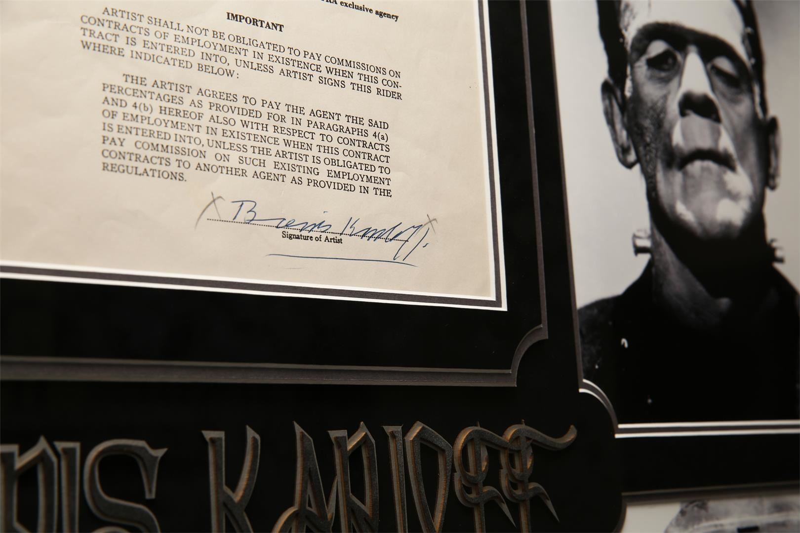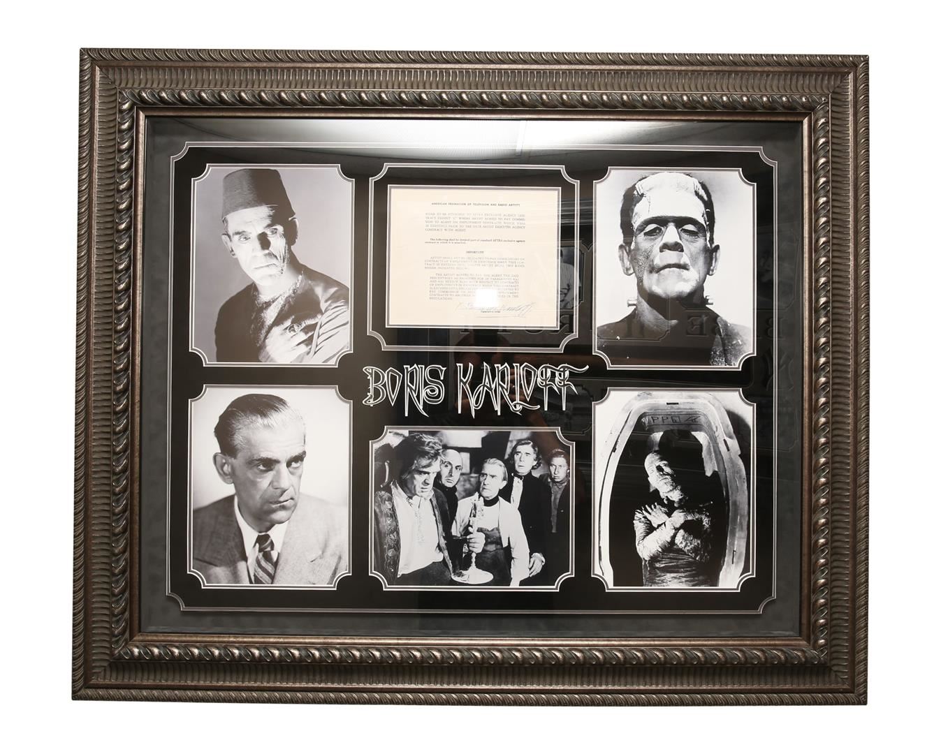 A Boris Karloff autographed contract collage. Measures 33" tall and 40" wide.