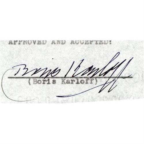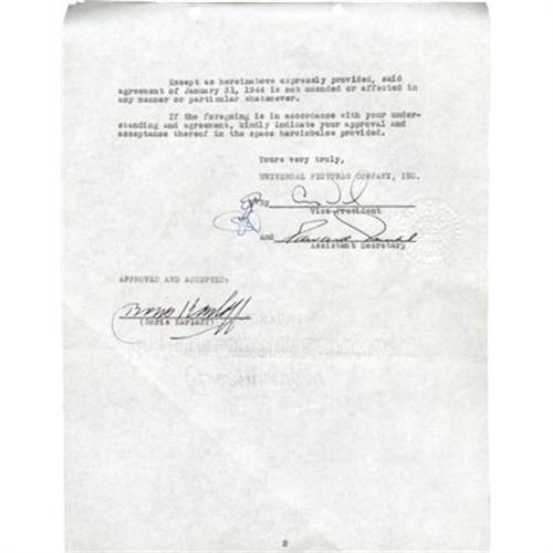 <B>Boris Karloff Signed</B></I> <B><I>House of Frankenstein</B></I></B></I> <B>Contract Amendment.</B></I> A two-page contract amendment dated September 23, 1944, guaranteeing Boris Karloff certain levels of billing in the credits and promotional materials for <I>House of Frankenstein,</B></I> initialed on the front page and signed on the second by the actor in black ink. The movie would be Karloff's last film associated with the Frankenstein Monster. By this point, Glenn Strange had stepped into the role, and during production Karloff would personally coach Strange on how the Monster should be played. The document is in Very Fine condition with mild toning, handwritten notations in pencil to the top left corner, a very light tear on the lower left of the front page, and staples and binder holes to the top. <I>Accompanied by LOA from PSA/DNA.</B></I><BR><BR><b>Shipping:</b> Flat Material, Small (<a target="_blank" href="http://www.heritageauctions.com/common/shipping.php">view shipping information</a>)
