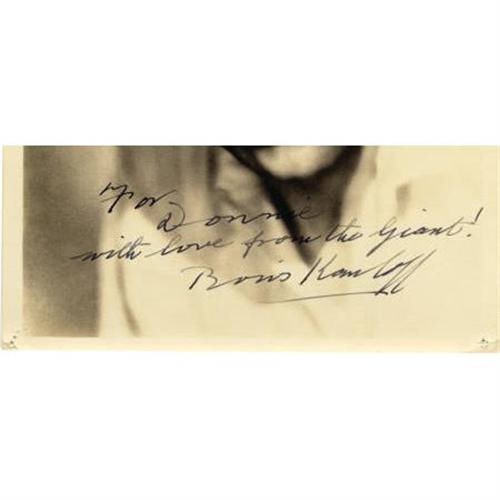<B>Boris Karloff Signed Photo to Donnie Dunagan.</B></I> A striking Karloff portrait, signed to a Universal co-player and with a great Frankenstein Monster connection. This is a b&w 8" x 10" headshot of the legendary star who played the "Monster" of the first three <I>Frankenstein</B></I> movies, inscribed "For Donnie with love from the giant!" to his pint-sized <I>Son of Frankenstein</B></I> co-star, child actor Donnie Dunagan, and signed by Karloff in black fountain ink. Karloff and the four-year old child actor formed a close bond during the production, as Boris taught the boy to play checkers, bought him ice cream, looked after him on the set, and, come Yuletide of 1938, gave his little friend a train set. Donnie sent a thank-you and a request for a signed photo, receiving this warmly-inscribed shot from the Horror King. Many Karloff fans consider this publicity portrait his finest from the 1930s. The reference to "the giant" (.e., the Monster) gives the picture a most desirable distinction, as does its affectionate sentiment to his <I>Son of Frankenstein</B></I> co-player. "I've loved Mr. Karloff almost all my life," says Don Dunagan today, and this wonderful signed portrait, a keystone of his archive for almost 70 years, shows the affection was mutual. In Fine condition with mild to moderate age toning, mild wear to the edges, and tack holes to the corners. <I>From the Donnie Dunagan Archive</B></I>.<BR><BR><b>Shipping:</b> Flat Material, Small (<a target="_blank" href="http://www.heritageauctions.com/common/shipping.php">view shipping information</a>)