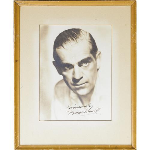 <B>Boris Karloff Signed Photo.</B></I> A b&w 8" x 10" photo signed by the <I>Frankenstein</B></I> star, matted and framed to an overall size of 12" x 15". In Excellent condition with some dings to the wooden frame. <I>Accompanied by LOA from PSA/DNA.</B></I><BR><BR><b>Shipping:</b> Framed (<a target="_blank" href="http://www.heritageauctions.com/common/shipping.php">view shipping information</a>) <BR><BR><B>Important notic