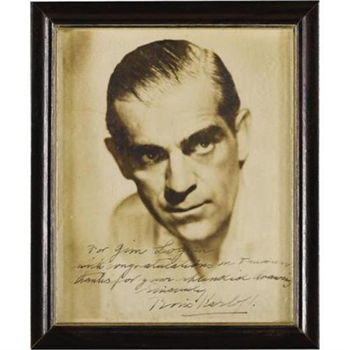 <B>Boris Karloff Signed Photo.</B></I> A splendid b&w 8" x 10" portrait of the horror movie icon, inscribed "For Jim Logan with congratulations and many thinks for your splendid drawing" and signed by Karloff in black ink. Framed to an overall size of 9.5" x 11.5", it is in Fine to Very Fine condition with moderate toning and some wear, soiling, and a little creasing. <I>From the Jim Logan Collection.</B></I> <I>Accompanied by LOA from PSA/DNA.</B></I><BR><BR><b>Shipping:</b> Framed - without Glass, Small (<a target="_blank" href="http://www.heritageauctions.com/common/shipping.php">view shipping information</a>)