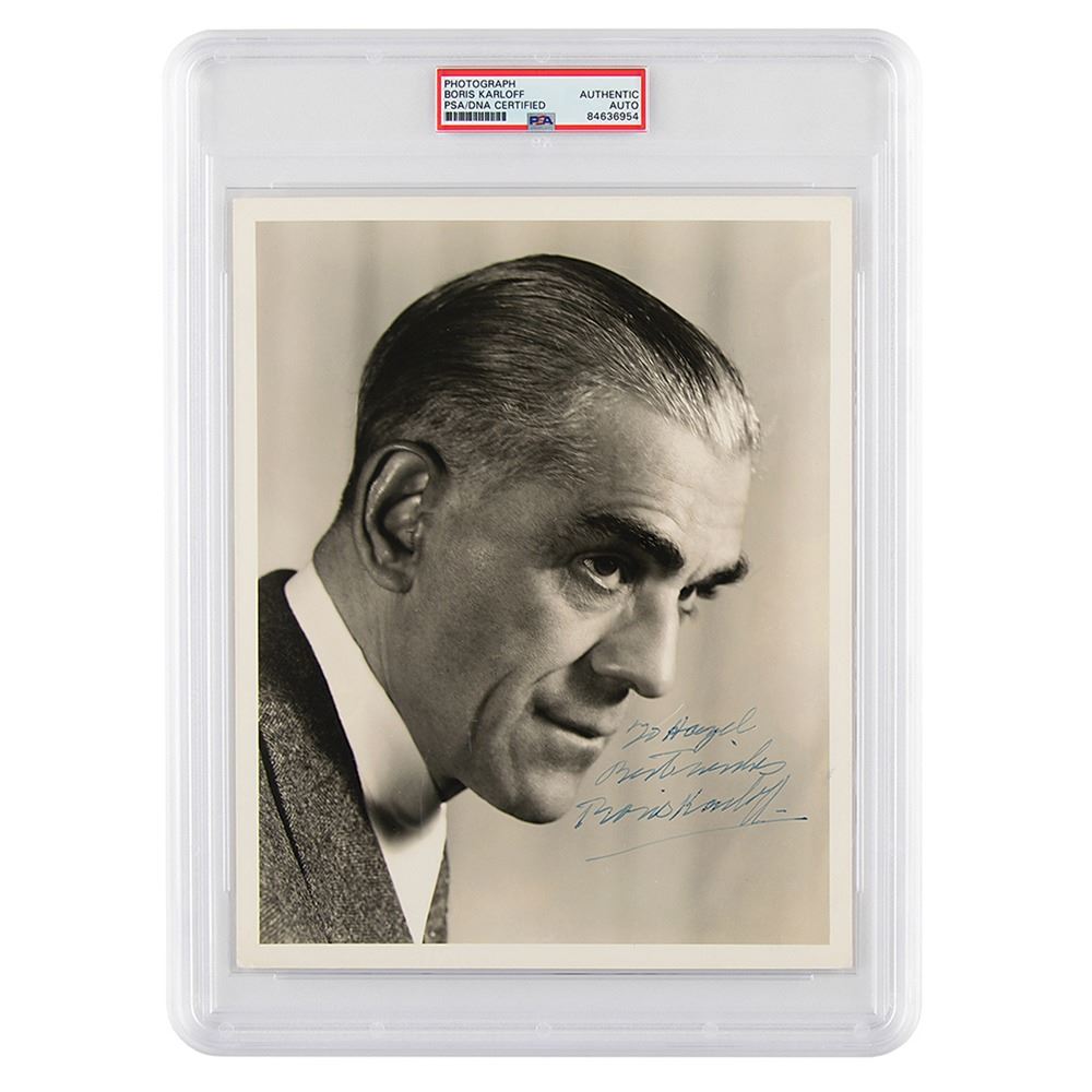 Superb vintage matte-finish 8 x 10 close-up photo of the horror movie legend, signed and inscribed in fountain pen, "To Hazel, Best wishes, Boris Karloff.†In fine condition. Encapsulated in a PSA/DNA authentication holder. The recipient, Hazel Healy, was the wife of longtime RKO chief stagehand Fred Healy.