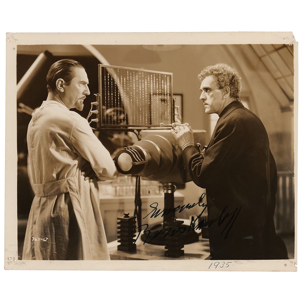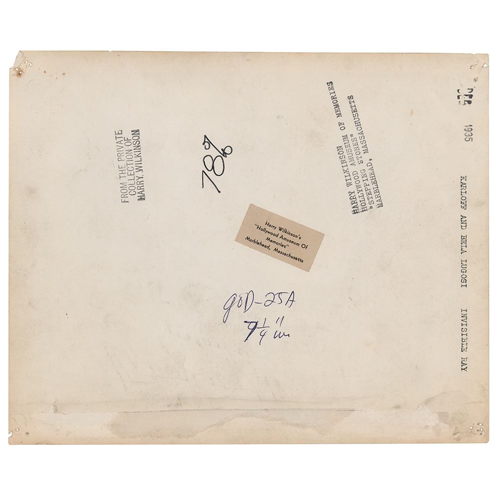 Vintage glossy 9.75 x 8 photo of Boris Karloff as Dr. Janos Rukh and Bela Lugosi as Dr. Felix Benet in the 1936 science-fiction horror film The Invisible Ray, signed in bold fountain pen, "Sincerely, Boris Karloff." Reverse bears a label and stamps identifying it as being from the collection of Harry Wilkinson. In very good to fine condition, with tack holes to the corners, and a missing upper right corner tip. For many years noted collector Harry Wilkinson maintained the highly regarded Hollywood Museum of Memories in Marblehead, Massachusetts.