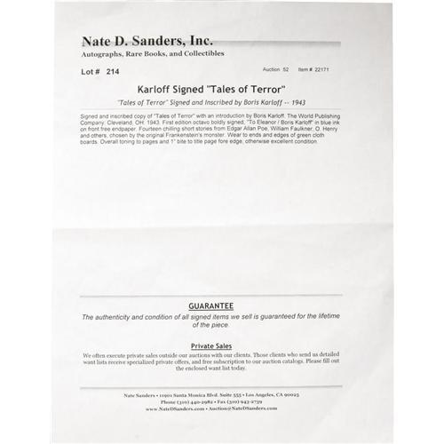 <B>Boris Karloff Signed "Tales of Terror."</B></I> A first edition copy of the 1943 horror anthology, inscribed and signed by Karloff, who edited the tome, in blue ink on the front free endpaper. In Fine to Very Fine condition with mild wear and mild to moderate toning. <I>Accompanied by a certificate of authenticity.</B></I><BR><BR><b>Shipping:</b> Books & Catalogs (<a target="_blank" href="http://www.heritageauctions.com/common/shipping.php">view shipping information</a>)