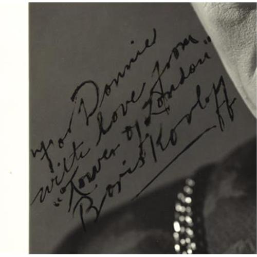 <B>Boris Karloff Signed Photo from "Tower of London".</B></I> "Karloff can't be taken seriously, else he would drive one insane from fright," wrote the <I>New York Times Q critic after viewing Universal's <I>Tower of London</B></I> (1939). The medieval melodrama presented Karloff in one of most vividly wicked roles - Mord, the bald-pated, club-footed, axe-swinging Tower executioner, begging Richard III (Basil Rathbone) to allow him to enter battle and kill "in <I>hot</B></I> blood." Karloff signed this spine-chilling original 8 "x 10" portrait of himself as "Mord " in black fountain ink to Donnie Dunagan, "For Donnie with love from 'Tower of London' Boris Karloff." Dunagan played "Baby Prince Richard" in <I>Tower of London,</B></I> and he and Karloff had acted previously, of course, in Universal's <I>Son of Frankenstein</B></I> (1939). There 's a pin hole in each of the border corners, and the reverse bears the green-ink stamp, "BORIS KARLOFF Appearing in Universal Pictures" In Excellent condition. Donnie Dunagan has great personal affection for "Mr. K," and this wonderful signed photo has been an especially prized item in his personal collection for almost seventy years. <I>From the Donnie Dunagan Archive.</B></I>.<BR><BR><b>Shipping:</b> Flat Material, Small (<a target="_blank" href="http://www.heritageauctions.com/common/shipping.php">view shipping information</a>)
