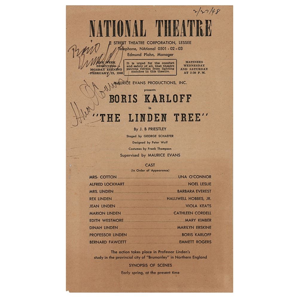 Cast listing page from the National Theatre's program for The Linden Tree, 5.25 x 9, signed in fountain pen by Boris Karloff and Una O'Connor. A collector's date notation to the upper right reads: "2/27/48." In very good to fine condition, with three horizontal folds and a few light rusty paperclip marks along the left edge. Karloff and O'Connor co-starred in Universal's classic 1935 sci-fi horror film Bride of Frankenstein.