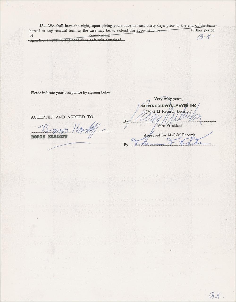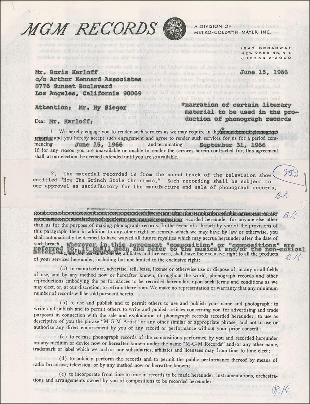 DS, four pages, 8.5 x 11, June 15, 1966. Karloff agrees to terms with MGM Records for “narration of certain literary material to be used in the production of phonograph records.” In part: “The material recorded is from the sound track of the television show entitled ‘How The Grinch Stole Christmas.’ Each recording shall be subject to our approval as satisfactory for the manufacture and sale of photograph records…We shall pay you for your services to be rendered hereunder and for the rights granted herein, a royalty of, three percent…of the suggested retail list price.” Signed at the conclusion of the last page and initialed by Karloff sixteen times! Slight wrinkling, several staple holes at the top corner of each page, and a tiny tear at the upper left edge of each page, otherwise fine condition. Karloff’s narration of the animated holiday special remains a beloved tradition nearly 45 years after its release!