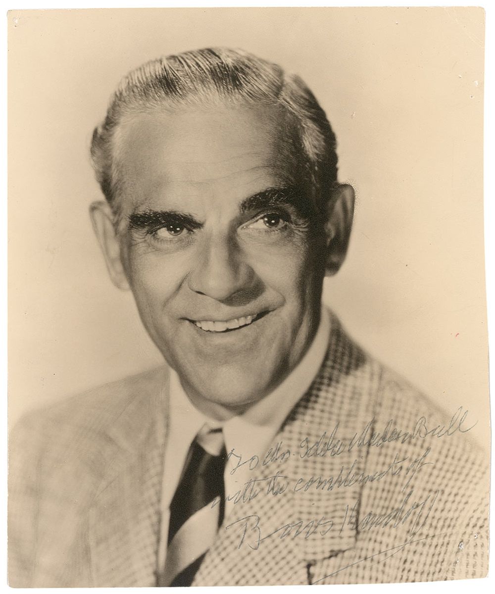Vintage matte-finish 7 x 8.25 photo, signed and inscribed in black ballpoint “To Mrs. Idda Madan Bull, with the compliments of Boris Karloff.” In very good condition, with trimmed edges, moderate contrast to signature and inscription, staple holes to three corners, and a few corner creases.