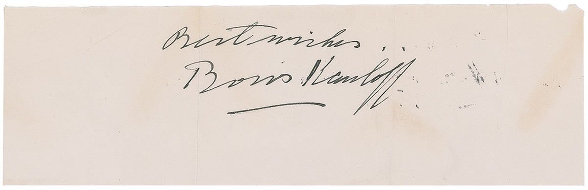 Bold vintage fountain pen signature, “Best wishes, Boris Karloff,” on an off-white 8.5 x 2.75 clipped slip. Two vertical folds, one passing through the first letter of the signature, and the other passing through the last two letters, some light toning, and a bit of light mirroring, otherwise fine condition. Accompanied by the original mailing envelope, postmarked April 26, 1938.