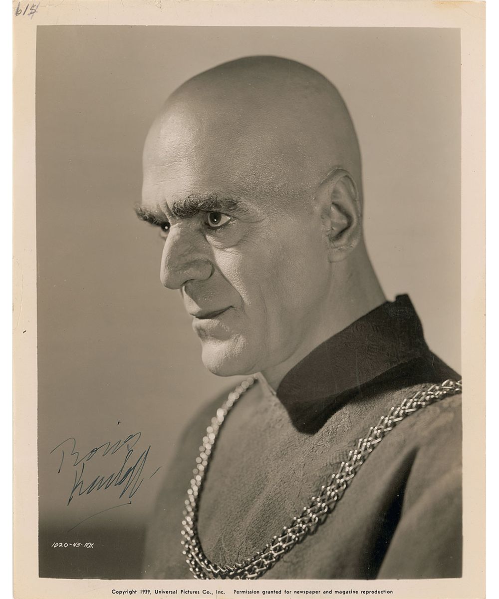 Intimidating vintage glossy 8 x 10 Universal publicity photo of Karloff as The Executioner in Tower of London, signed in fountain pen. Some scattered light creases, heavier along top edge, show-through from bold notations on reverse, ink notation to top left corner, and some mounting remnants to reverse edges, otherwise fine condition.