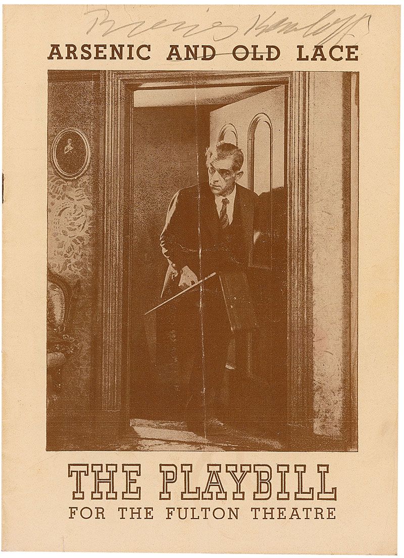 Fulton Theatre playbill, 6.75 x 9.25, 32 pages, for the production of ‘Arsenic and Old Lace,’ signed in pencil on the front cover, “Boris Karloff.” Central vertical fold, passing through a single letter of signature, mounting remnants and paper loss to back cover, and expected handling wear, otherwise fine condition. Karloff created the role of Jonathan Brewster in this, the original production, which preceded the film.