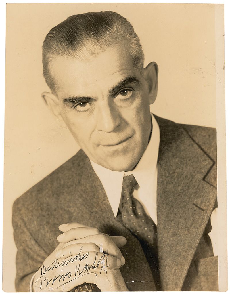 Vintage pearl-finish 7 x 9 Vandamm photo of Karloff in Arsenic and Old Lace, signed in black fountain pen, “Best wishes, Boris Karloff.” In good condition, with scattered creases and impressions, a tear to the bottom edge that passes through the end of the signature, silvering to dark areas of the photo, and three trimmed edges.