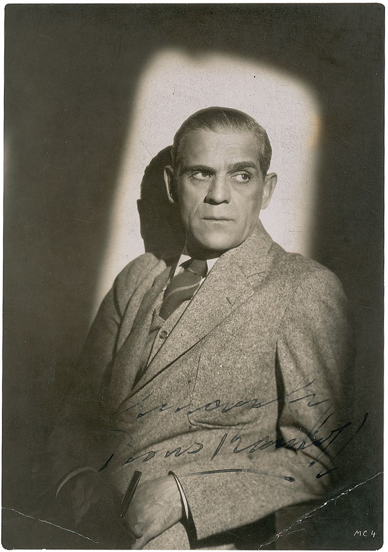 Vintage glossy 4.75 x 7 photo of Karloff bathed in a spotlight, signed in fountain pen, “Sincerely, Boris Karloff.” In very good condition, with a diagonal crease to both lower corners, scattered light surface marks, and silvering to darker areas of image and background.