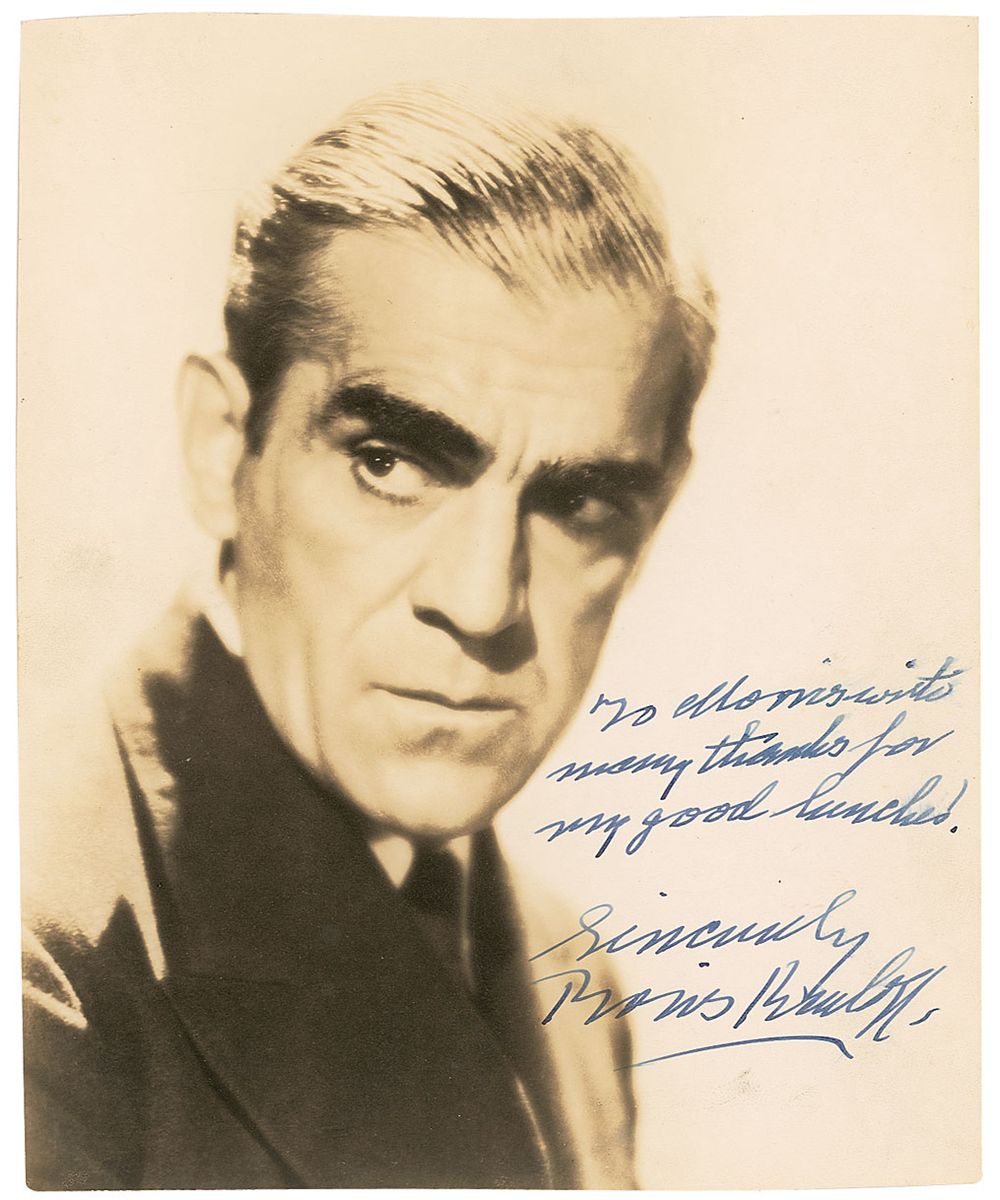 Terrific vintage matte-finish 7.75 x 9.25 portrait of Karloff, signed and inscribed in fountain pen, “To Morris, with many thanks for my good lunch! Sincerely, Boris Karloff.” In fine condition, with trimmed edges. A superb image with a well-placed signature, exhibiting excellent contrast against the white background.