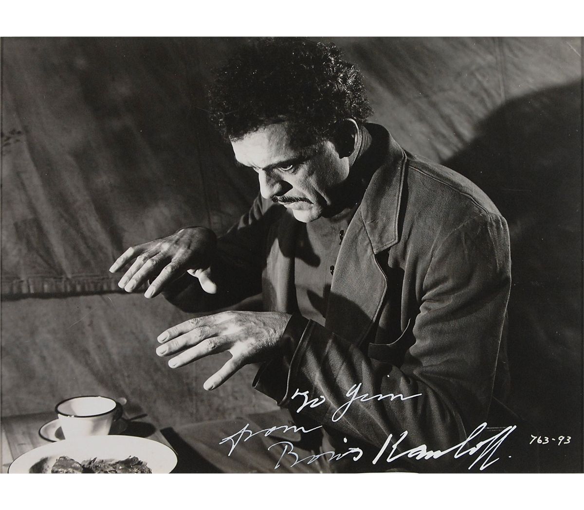 Vintage glossy 9 x 6.75 photo of Karloff as he appeared in the 1936 film The Invisible Ray, signed and inscribed in white ink, “To Jim, from Boris Karloff.” Matted to an overall size of 12 x 9.75. In fine condition, with a few surface creases and cracks to the emulsion (not affecting the extremely sharp image or bold signature).