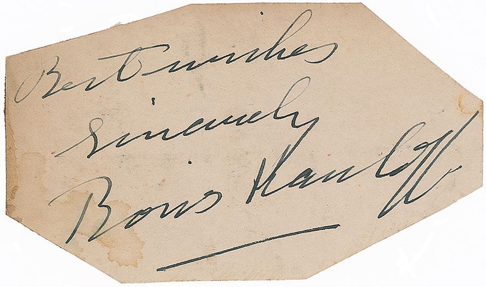 Vintage fountain pen signature, “Best wishes, Sincerely, Boris Karloff,” on an off-white 4.5 x 2.5 card. In very good condition, with scattered soiling, light dampstaining to lower left (affecting first letters of signature), and irregularly clipped edges.