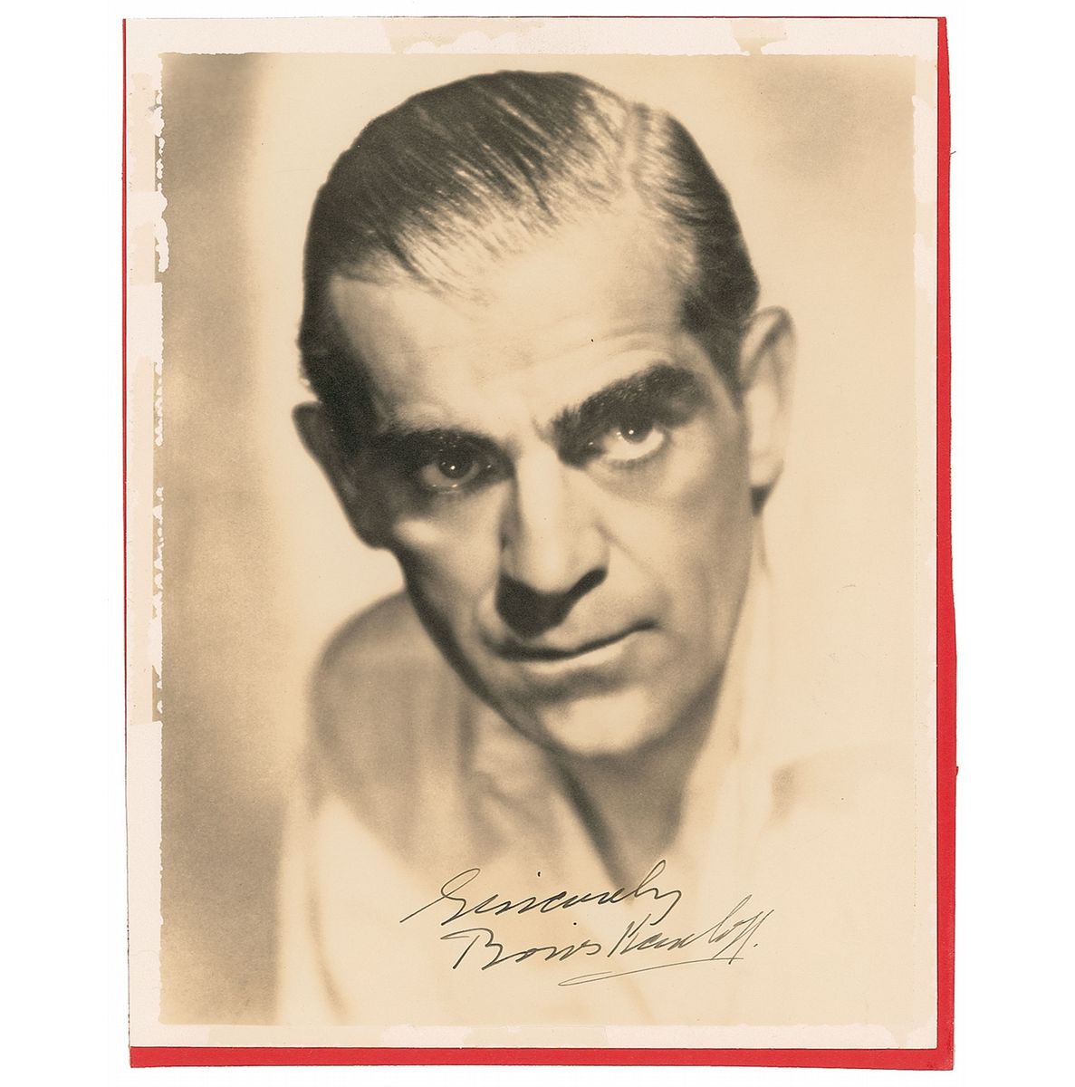 Vintage matte-finish 8 x 10 head-and-shoulders photo, signed in fountain pen, “Sincerely, Boris Karloff.” Photo is affixed to a slightly larger sheet of red cardstock. Surface loss and mounting remnants to edges, all of which could be matted out, otherwise fine condition.