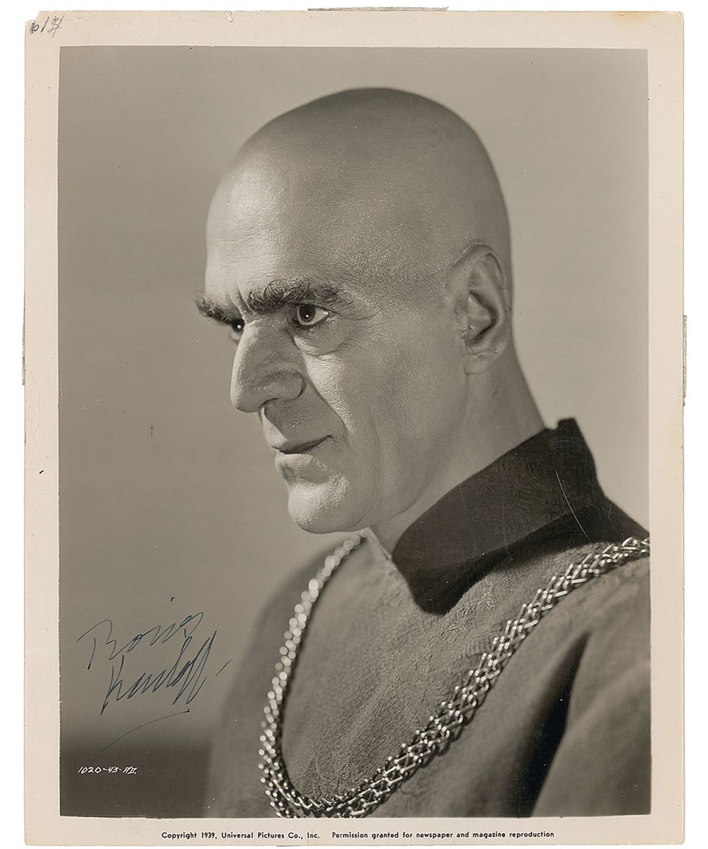 Intimidating vintage glossy 8 x 10 Universal publicity photo of Karloff as Mord the Executioner in Tower of London, signed in fountain pen. Some scattered light creases, heavier along top edge, show-through from bold notations on reverse, ink notation to top left corner, and some tape remnants to reverse edges, otherwise fine condition. A great portrait of one of Karloff’s more frightening characters.