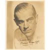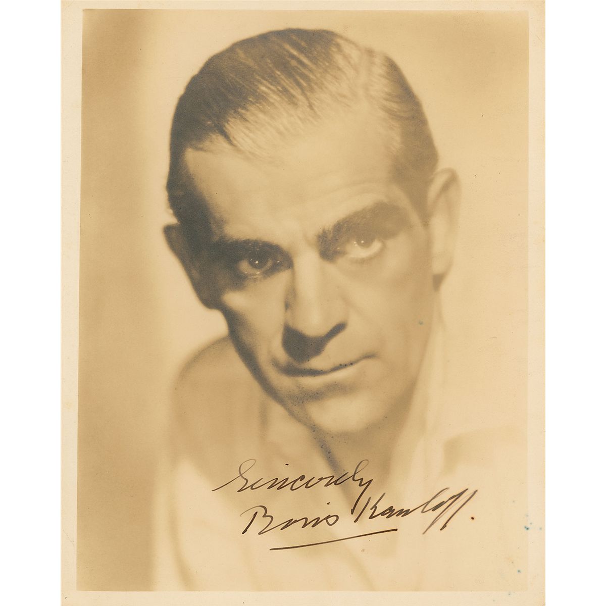 Matte-finish sepia 8 x 10 head-and-shoulders photo, boldly signed in fountain pen, “Sincerely, Boris Karloff.” In very good condition, with some scattered light spots (some to facial area), mild rippling, mainly along right edge, some light marks to finish, and slight spreading of ink to final portion of signature.