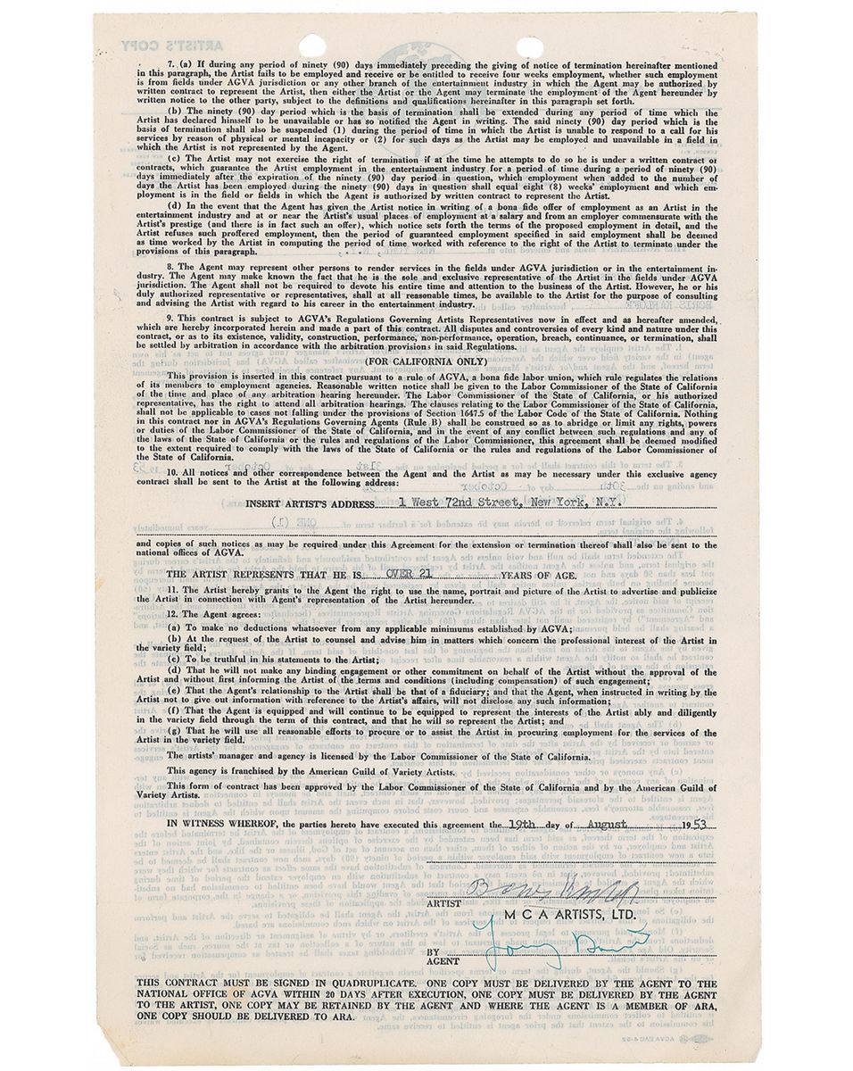 DS, one page both sides, 8.5 x 13.25, August 19, 1953. Exclusive agency contract in which Karloff agrees to be represented by MCA Artists, Ltd., for a period of one year at the standard rate of 10%. Signed at the conclusion in ballpoint by Karloff and countersigned by his agent. A few stains, tear to one corner, and expected filing and staple holes, otherwise fine condition.
