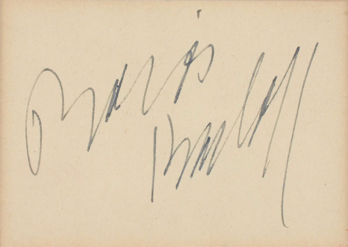 Vintage fountain pen signature, “Boris Karloff,” on an off-white 3.5 x 2.5 slip. Matted and framed with a photo of Karloff to an overall size of 12.5 x 15.5. In fine condition, with uniform toning.