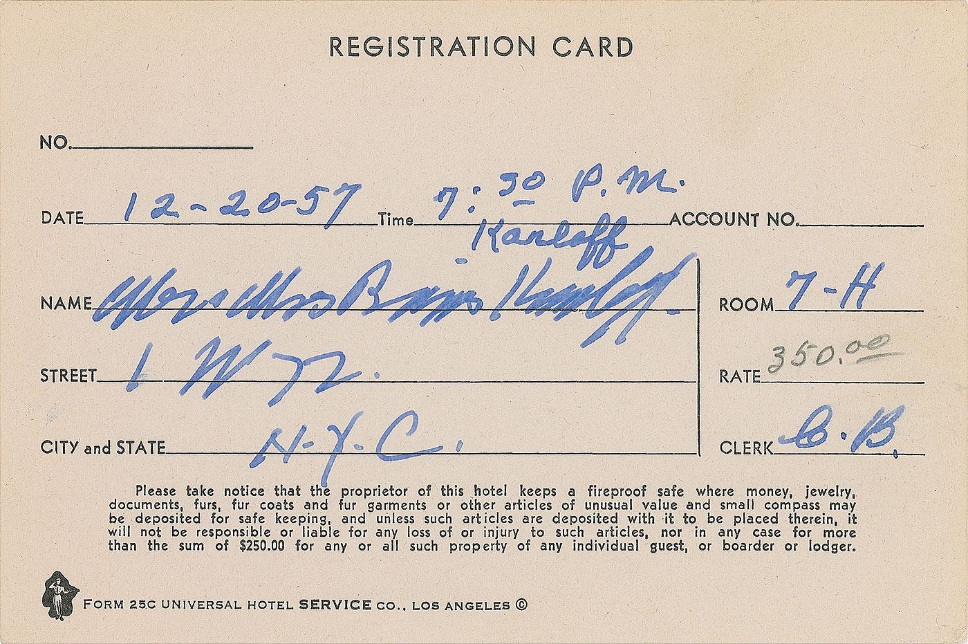 Hotel registration card from the Chateau Marmont Hotel in Los Angeles, 6 x 4, December 20, 1957, filled out in fountain pen by Karloff with his party's name and address, "Mr. & Mrs. Boris Karloff, 1 W 72, N.Y.C." The top line and right side are filled out by a clerk, noting a rate of $350 per night. In fine condition. Karloff's residence at 1 West 72nd Street in New York City is better known as The Dakota—an iconic home to the rich and famous, and the location of John Lennon's murder. Exterior shots of the building were used in the 1968 film Rosemary's Baby. The Chateau Marmont, an equally famous landmark on the opposite coast, figures prominently in many artistic works, and is remembered as the site of John Belushi's overdose. This registration card is thus a unique piece that weaves together several pop cultural threads.