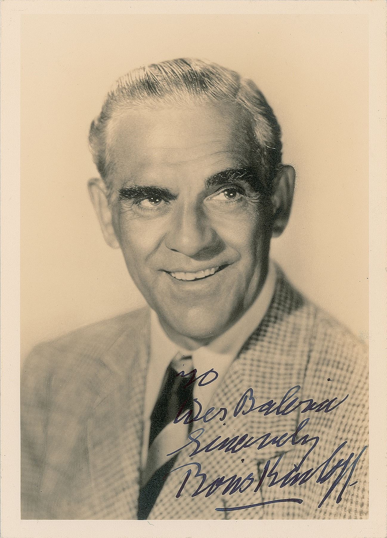 Vintage matte-finish 5 x 7 photo of Karloff in a handsome bust-length pose, signed and inscribed in fountain pen, "To Wes Balina, Sincerely, Boris Karloff.” In very fine condition.