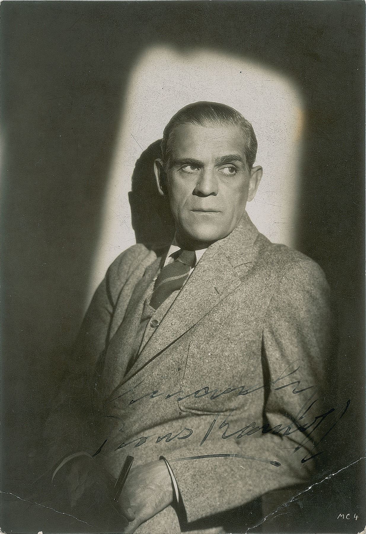 Brilliant vintage glossy 4.75 x 6.75 photo of Karloff in a brooding half-length pose, signed in fountain pen, "Sincerely, Boris Karloff." In very good to fine condition, with creases to the lower corners, and light silvering to the darker areas of the image.