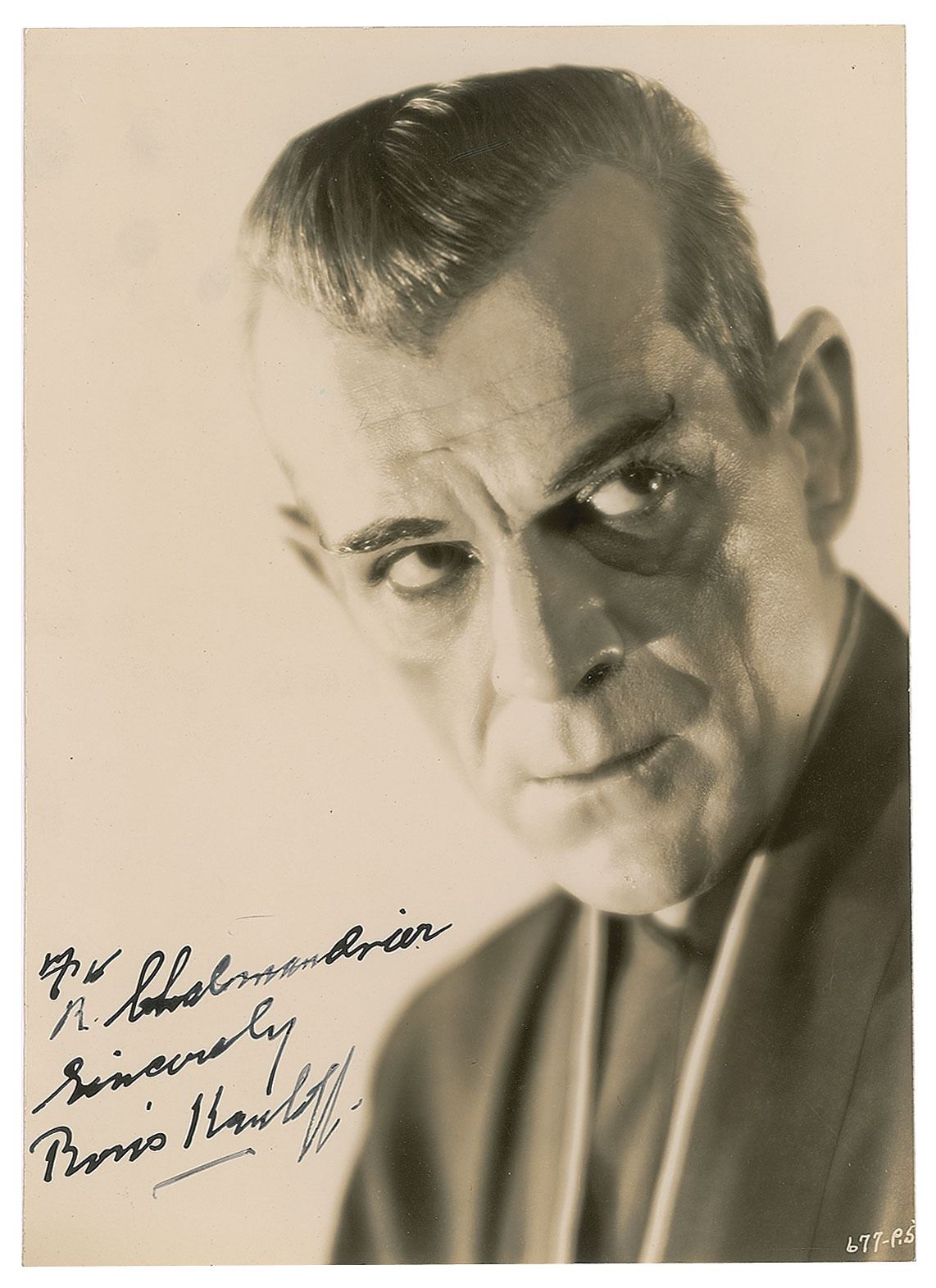 Vintage glossy 6.5 x 9.25 photo of Karloff as Hjalmar Poelzig from the 1934 horror film The Black Cat, signed and inscribed in fountain pen, "For R. Malmandrier, Sincerely, Boris Karloff.” In fine condition, with trimmed edges. Released in UK cinemas under the title House of Doom, the picture was the first of eight movies to pair Béla Lugosi and Karloff, with the latter playing a Satanist who is famously skinned alive at the movie's conclusion.