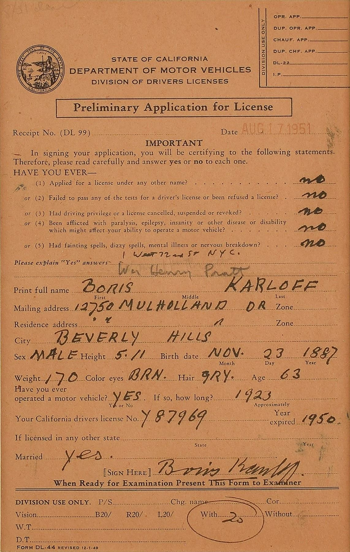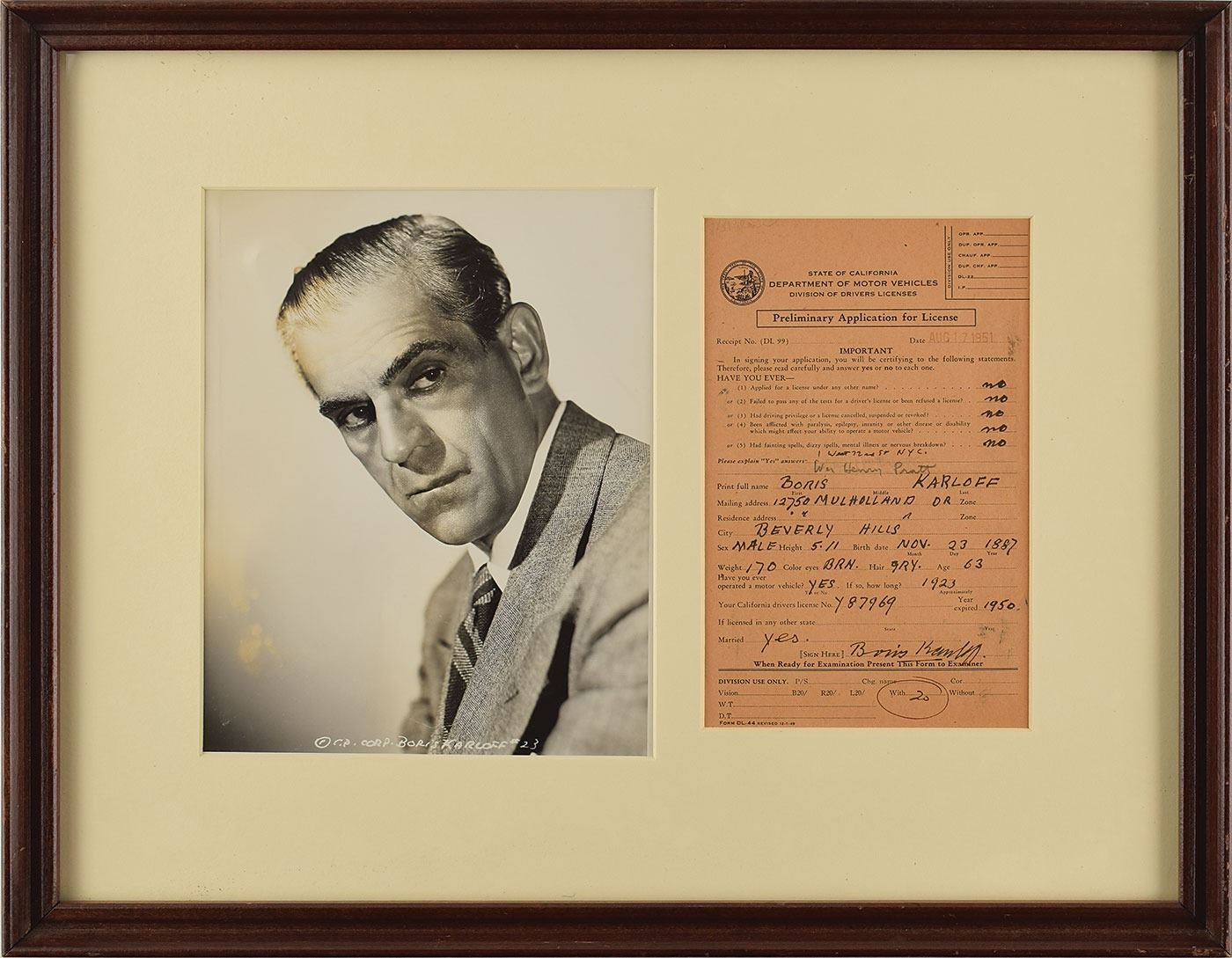 Twice-signed DS, one page, 5.25 x 8.25, August 17, 1951. Preliminary driver's license application for the State of California, which the 63-year-old Karloff fills out entirely in black ink and signs twice. Additionally, Karloff writes his mailing address, "12750 Mulholland Dr.," city, "Beverly Hills," and several of his physical characteristics. Another hand has added his given name in pencil, "Wm Henry Pratt." Matted and framed with glossy photo to an overall size of 19.25 x 15.25. In fine condition.