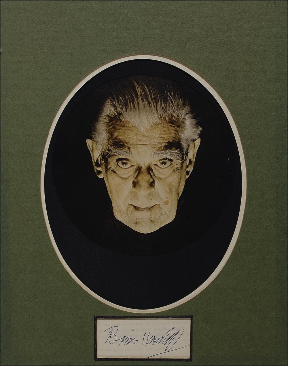 Vintage ballpoint signature, “Boris Karloff,” on an off-white slip. Matted with a ghoulish color photo of Karloff, to an overall size of 11 x 14. In fine condition, with light show-through from printed text on reverse. Pre-certified PSA/DNA and RRAuction COA.