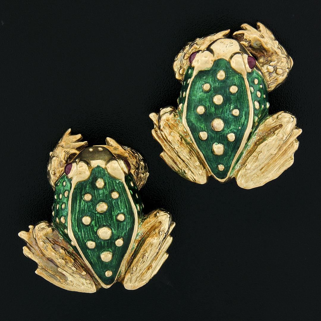 A solid 18k yellow gold frog earrings by Boris Le Beau, with green enamel work & 4 round cabochon cut natural rubies (0.60ctw). The earrings measure approximately 31.5x28.8mm and weigh a total of 38.82 grams.