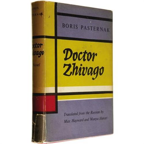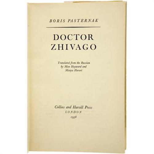 <B>Boris Pasternak: First Edition of <I>Doctor Zhivago</B></I></B></I> (London: Collins and Harvill Press, 1958), first edition, 510 pages, red cloth with gilt lettering on the spine and front board, 8vo (5.75" x 8.5"), original issue "21s. net" dust jacket. The book displays mild toning to the edges, else fine. The dust jacket has a Y-shaped closed tear on the spine, two 2.25" closed tears on the rear panel, three fingernail-sized coffee stains on the back panel, and mild edge wear, else very good.<BR><BR><b>Shipping:</b> Books & Catalogs (<a target="_blank" href="http://www.heritageauctions.com/common/shipping.php">view shipping information</a>)