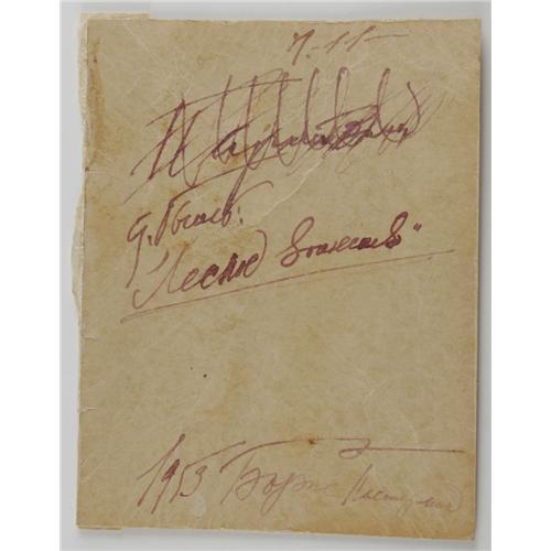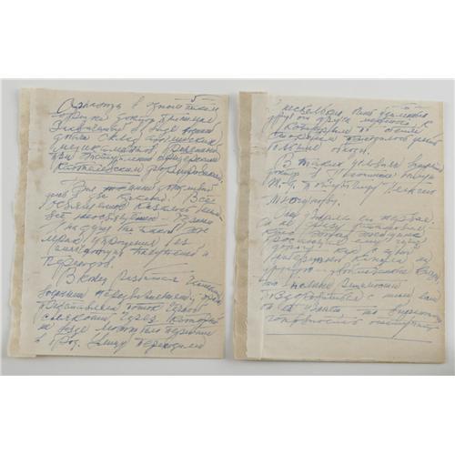 <B>Boris Pasternak Handwritten Doctor Zhivago Text.</B></I> Boris Pasternak, Soviet poet and writer, virtually unknown by name in the Western World. His greatest work this side of the International Date Line is his novel <I>Doctor Zhivago,</B></I> which, tragically, represented his views of Soviet Russia. This lot features 23 handwritten pages of Doctor Zhivago; from Chapter 11, which he calls, "<I>The Forest Warriors.</B></I>" In most American editions this chapter is translated as, "The Forest Brotherhood." On the cover page which precludes the 22 pages of text he writes his name, "<I>Boris Pasternak;</B></I>" the entire manuscript and signature are all in Russian (Cyrillic alphabet). The first few lines of the manuscript read, "<I>…It was more than a year since Yuriy Andreyevich had been taken prisoner by the partisans. The limits of his freedom were very ill defined. The place of his captivity was not surrounded by walls; he was not under guard, and no one watched his movements. The partisan force was constantly on the move, and Yuriy Andreyevich moved with it. It did not remain apart from the local population through whose lands and settlements it passed; it mixed and indeed dissolved in it…</B></I>" Pasternak's words would come to captivate a nation of Westerners who had never before had such a glimpse of the Russia that lay beyond its democratic sight. Aside from this novel, Pasternak is best known in Russia for his collection of poems, <I>My Sister - Life.</B></I> This group of poems has influenced generations of Russian writers, including the Futurists and those who sprung from those roots. His greatest work appeared in 1921, and was entitled <I>Rupture,</B></I> which many poets and critics called a work of pure, unbridled inspiration. This lot offers a wonderful chance to personally view Pasternak's work in his own hand; it is a chance few have ever had. <BR><BR>The manuscript is in very fine condition; each page is housed in a plastic sleeve; the pages are slightly yellowed, but all writing and annotations are bold and dark.