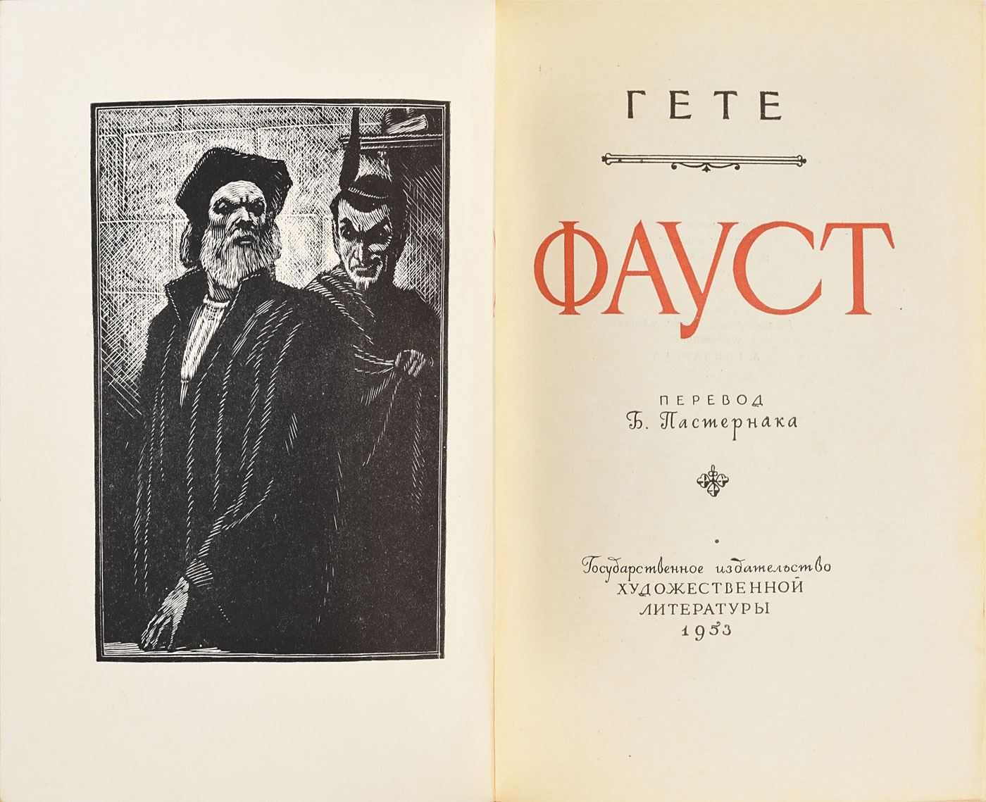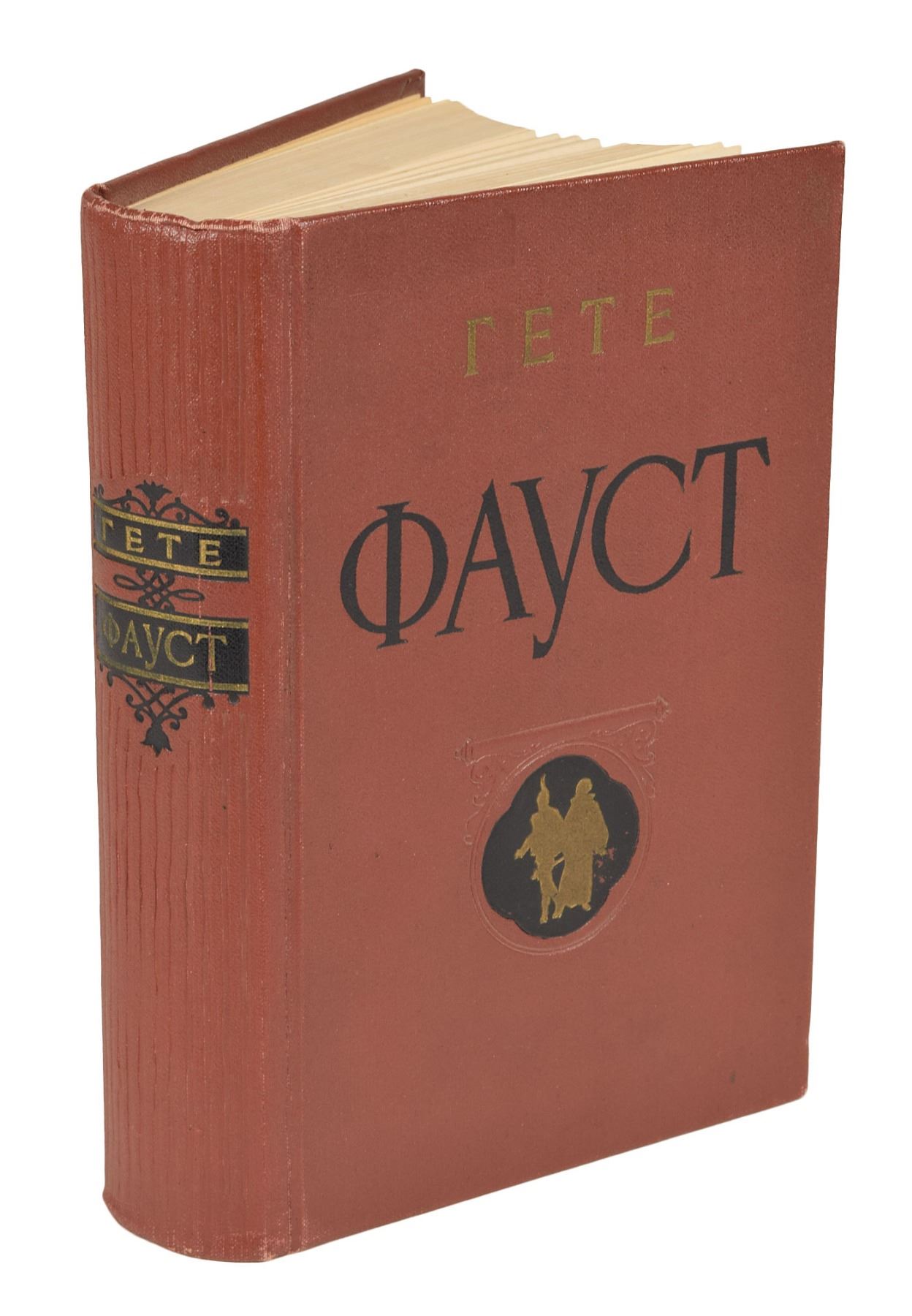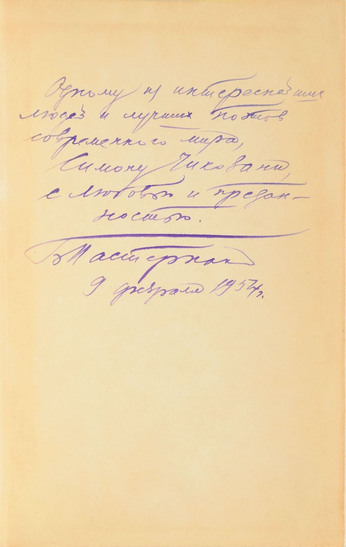 Russian writer and translator (1890–1960) whose novel Doctor Zhivago takes a place among the central works of twentieth-century literature. Signed book: Faust by Johann Wolfgang von Goethe, translated to Russian by Boris Pasternak. Moscow: Gos. Izdat. khudozhestvennoi literatury, 1953. Hardcover, 5.75 x 8, 616 pages. Neatly signed and inscribed on the first free end page in purple ink in Russian (translated): "To one of the most interesting people and best poets of present times, Simon Chikovani, with love and devotion, B. Pasternak, 9 February 1954." Autographic condition: fine, with a light block of toning to the signed page. Book condition: VG/None. Bound in original brown cloth, spine and front cover stamped in black and gold, spine ruled in blind. Chikovani, perhaps best known as spokesman for the group H2SO4, is considered one the of most innovative 20th-century Georgian poets. A wonderful association copy, linking three important poets across time and place.