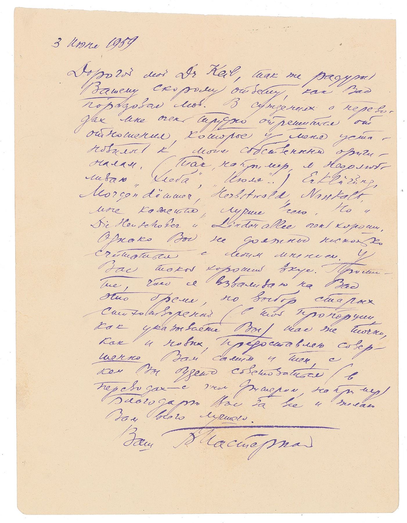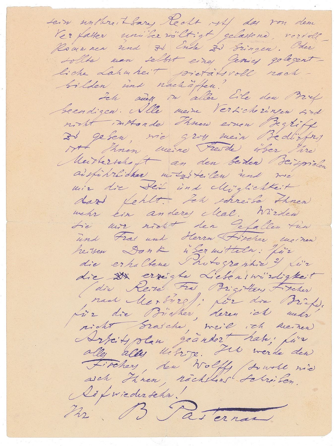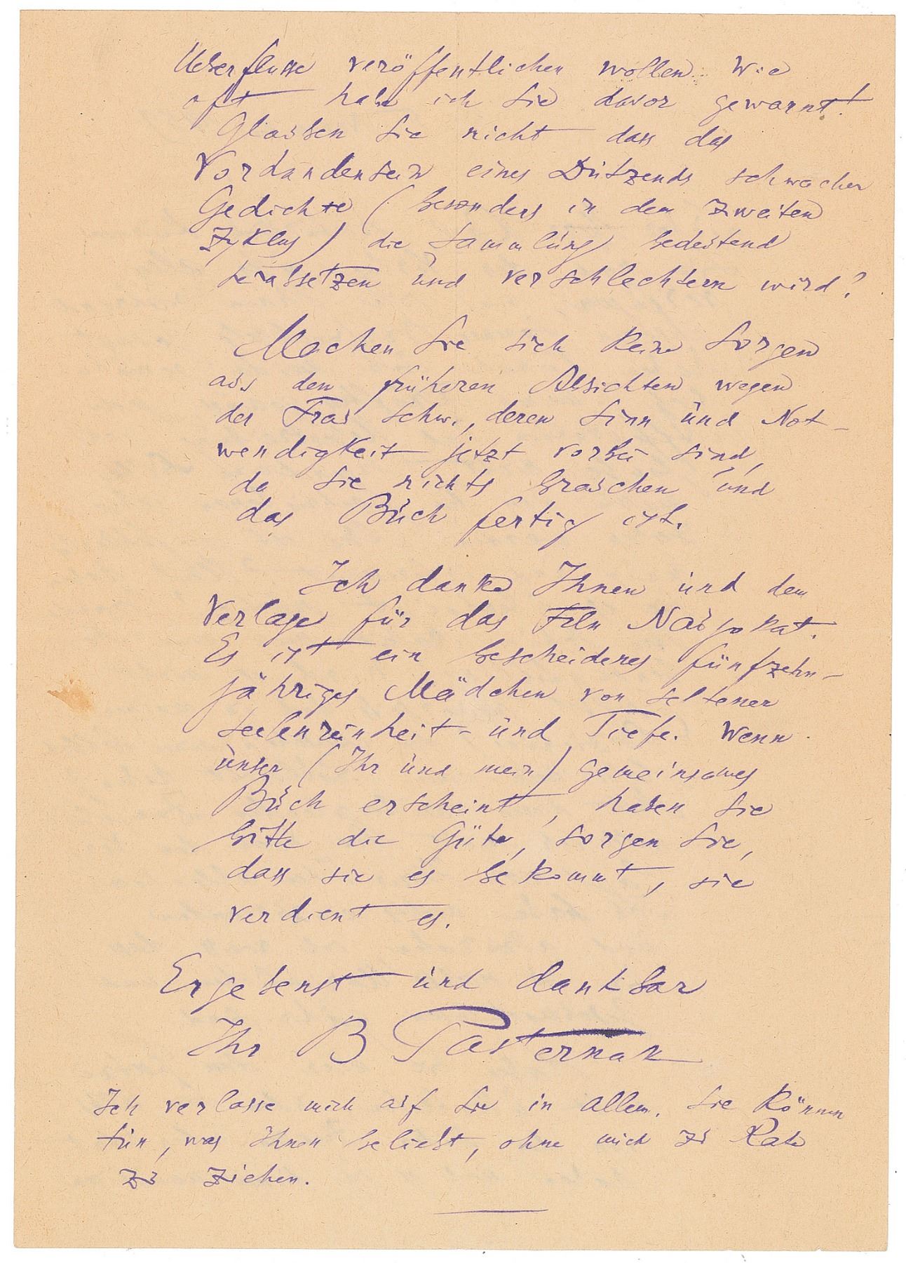 On September 14, 1959, he writes, in part (translated): "Among my many correspondents in Germany, there are also some in villages and in the deepest German province. One of them is especially characterized by her modesty and purity of heart. It may well be that in the winter I promised her a copy of a Zhivago by the publisher and had forgotten about it and did not write about it to Frankfurt. Send my sincerely regards to the dear couple."