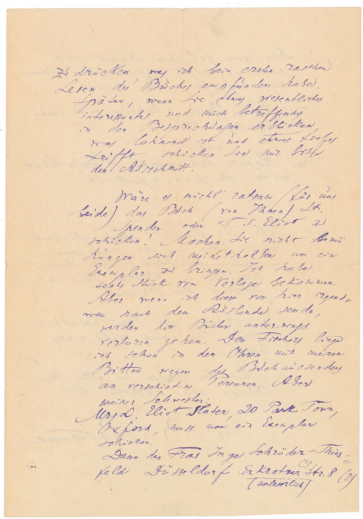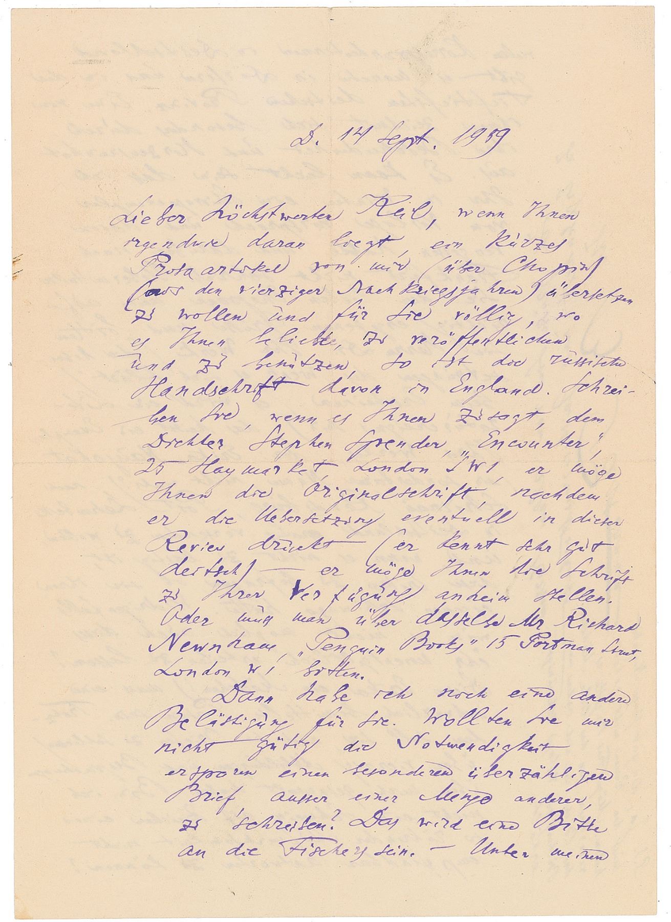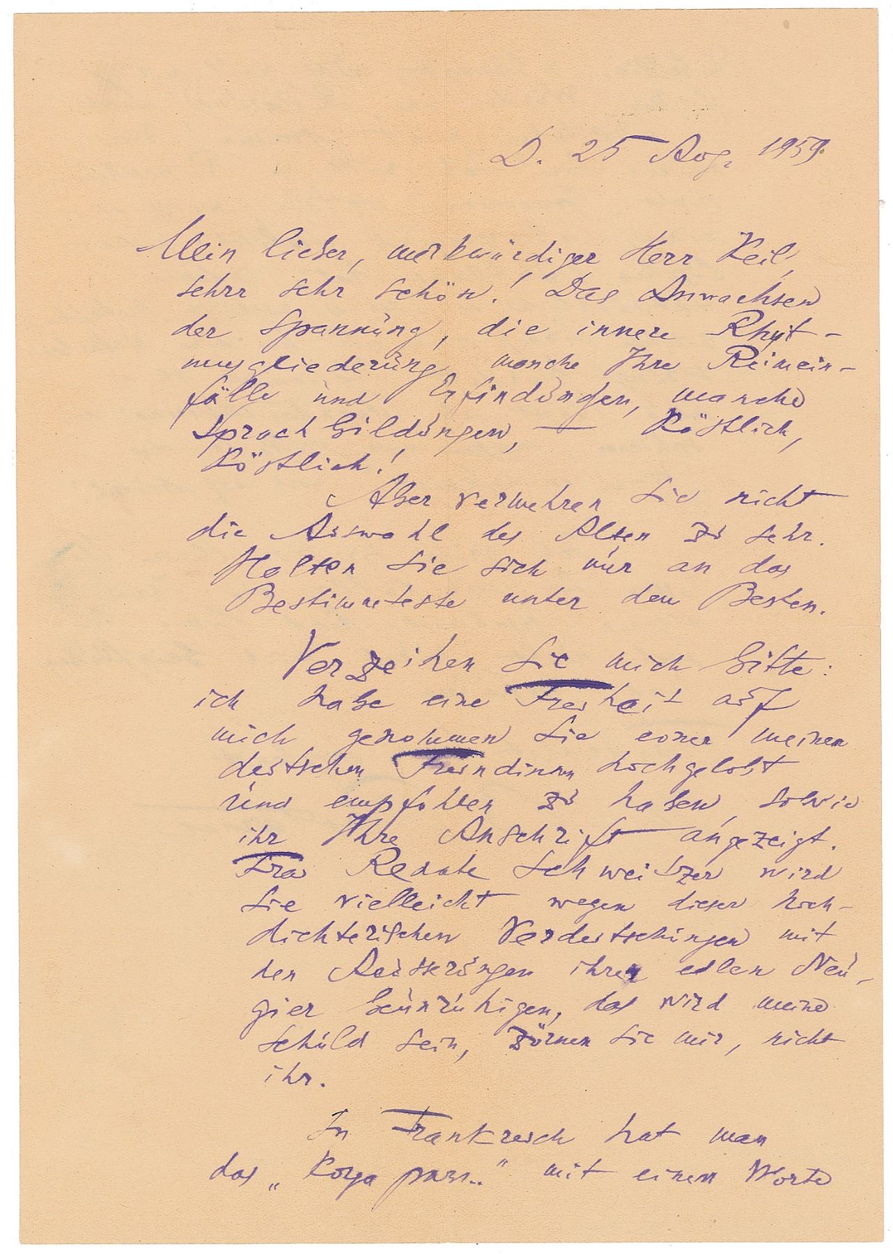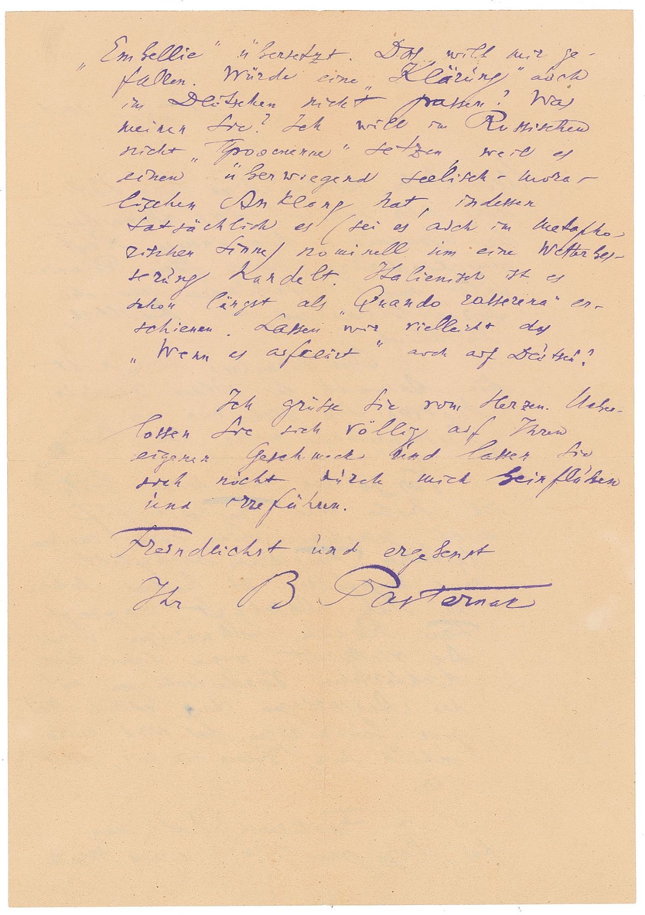 On September 14, 1959, he writes, in part (translated): "Among my many correspondents in Germany, there are also some in villages and in the deepest German province. One of them is especially characterized by her modesty and purity of heart. It may well be that in the winter I promised her a copy of a Zhivago by the publisher and had forgotten about it and did not write about it to Frankfurt. Send my sincerely regards to the dear couple."