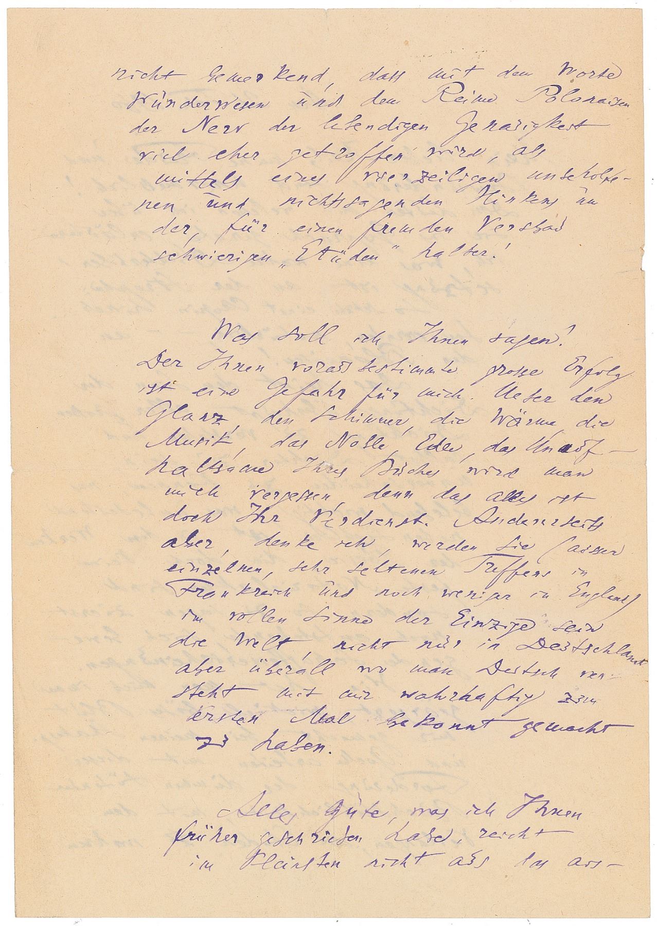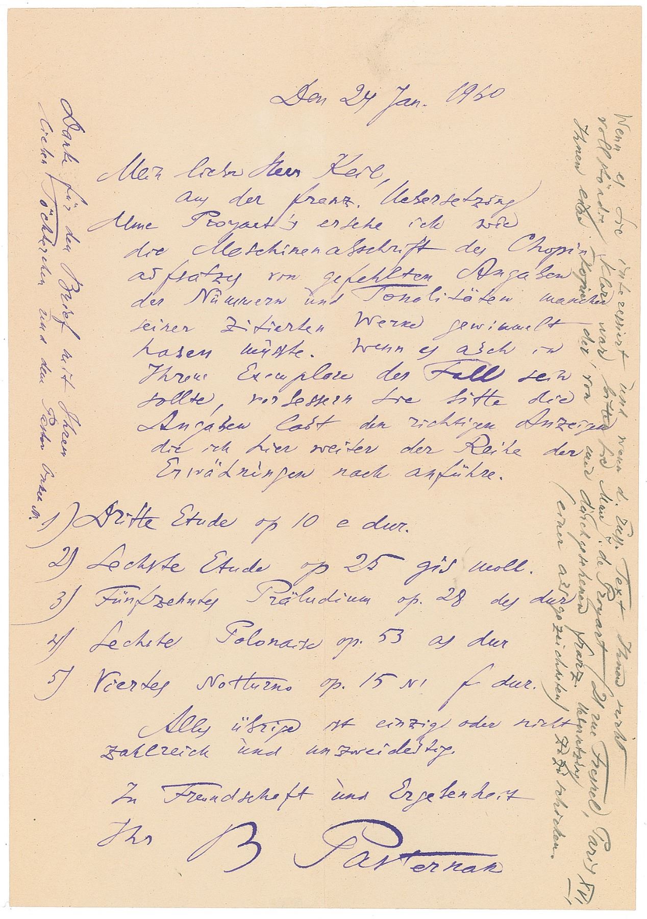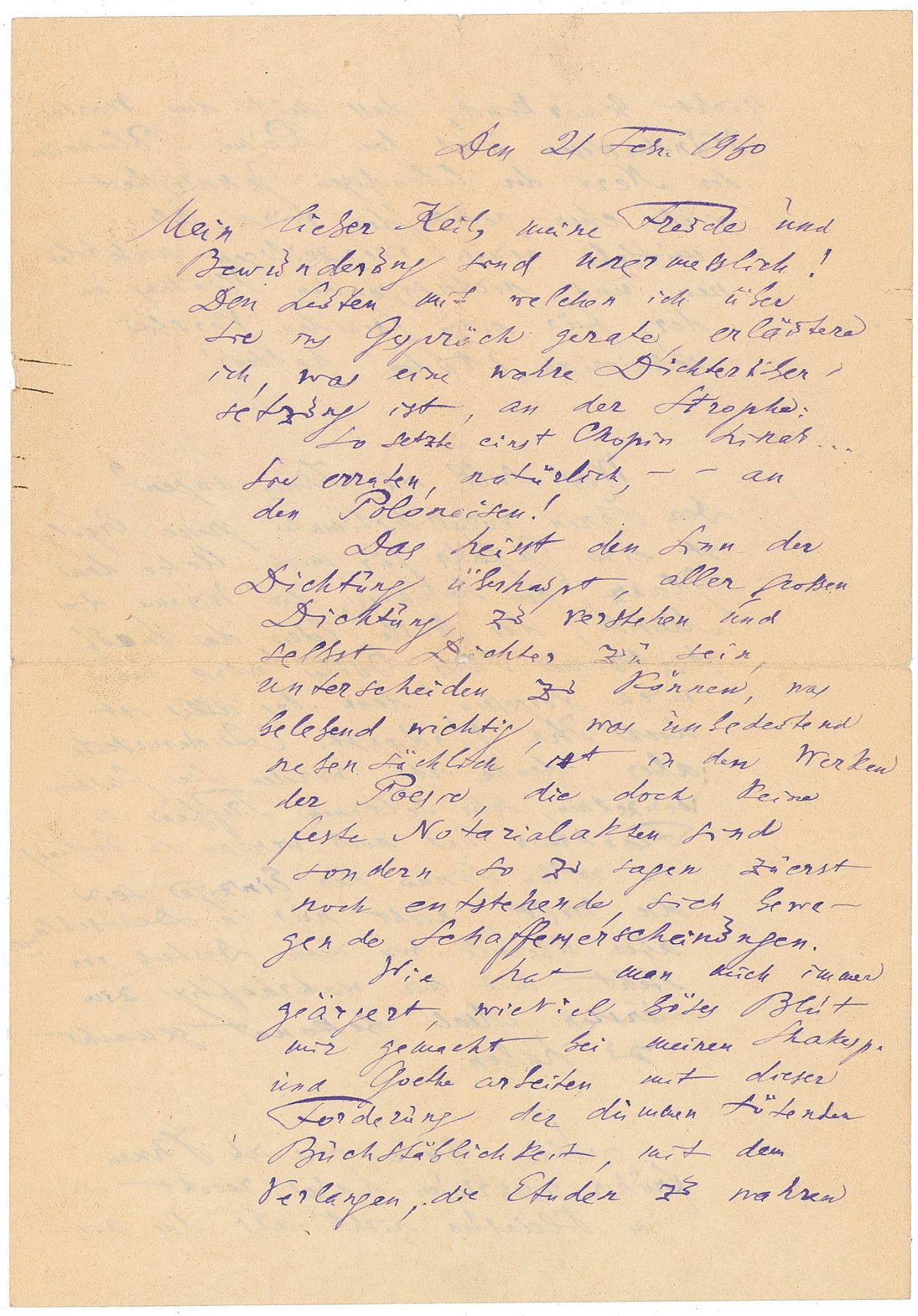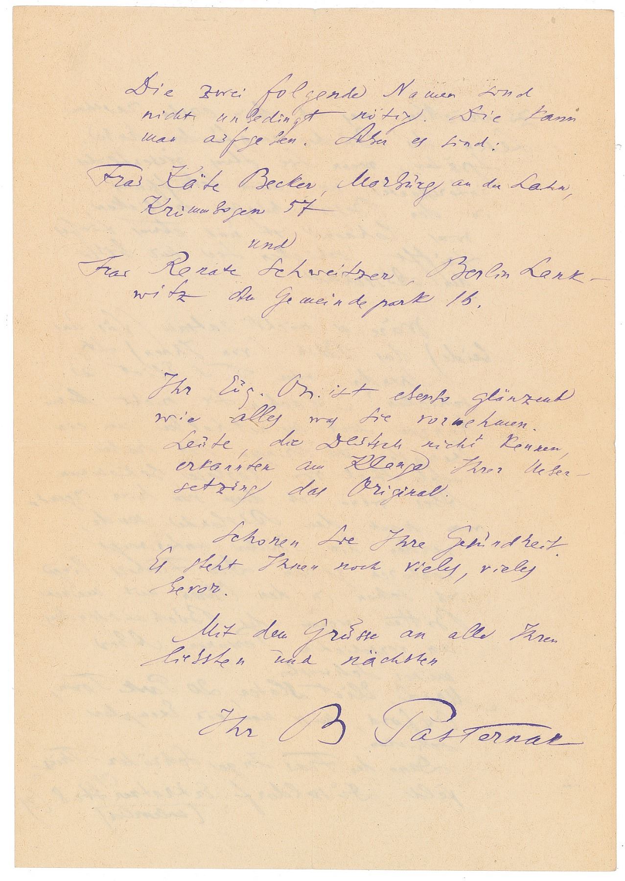 On February 21, 1960, he writes about the translation of a work on Chopin, in part (translated): "The meaning of poetry in general to understand all great poetry and to be a poet, to be able to distinguish what is invigoratingly important, what is insignificant in the works of poetry, which are not fixed notarial acts but so too first say still arising, moving creations. How was I always annoyed, how much bad blood I made in my Shakesp[eare] and Goethe work with this demand of stupid killing literalness, with the desire to preserve the etudes unnoticed that with the word miracle beings and the rhymes Polonaises the nerve of lively accuracy, rather than by means of a four-line clumsy and meaningless limping, for the sake of the etude, which is difficult for a foreign versification! What can I tell them? The great success predicted for you is a danger to me. One will forget about the splendor, the shimmer, the warmth, the music, the noble, the unstoppable of your book, for all this is your merit." In overall fine condition. Accompanied by the original mailing envelopes, all addressed in Pasternak's hand, with the stamps clipped off. Also includes two letters by Pasternak's sister Josefine, and one by his sister Lydia.