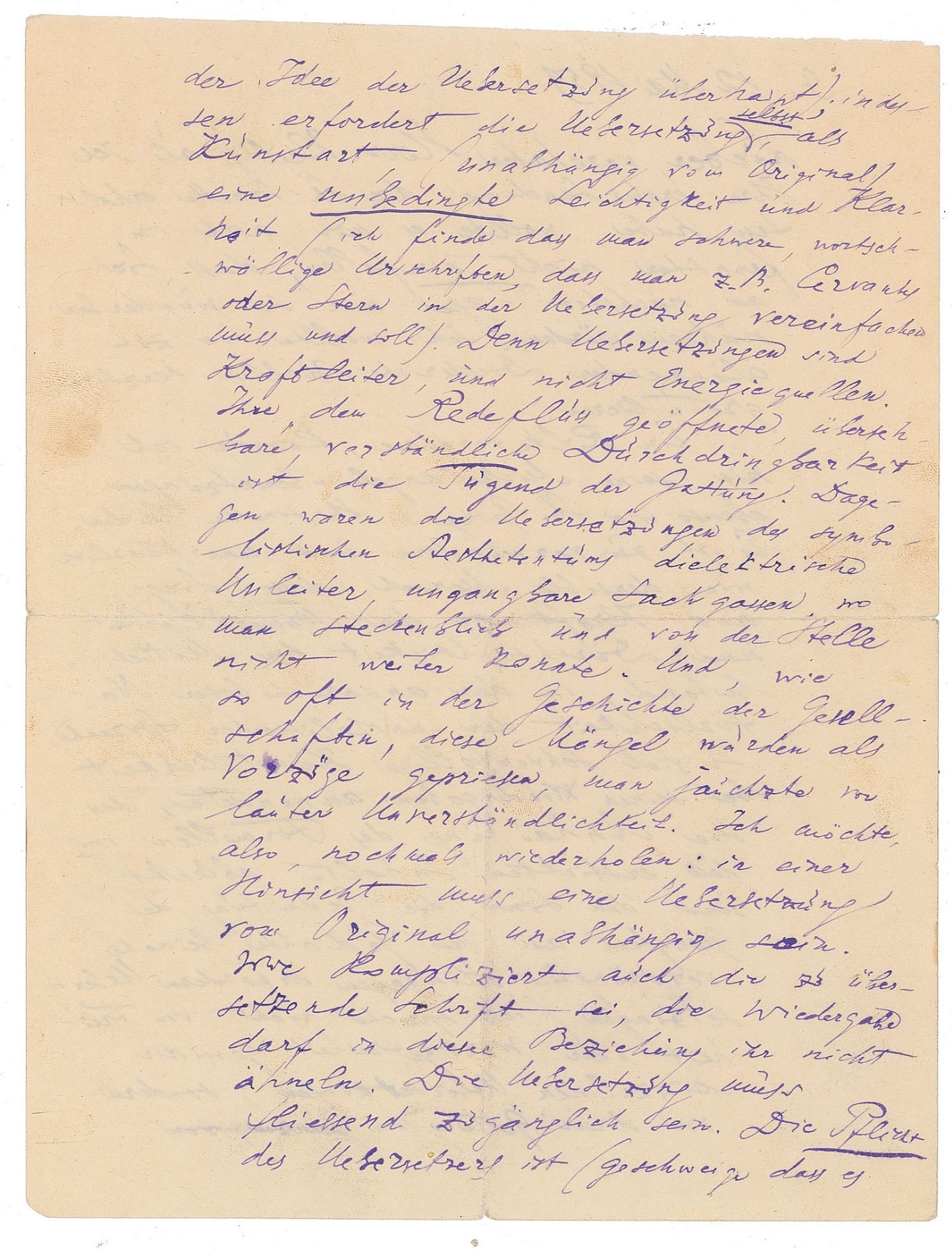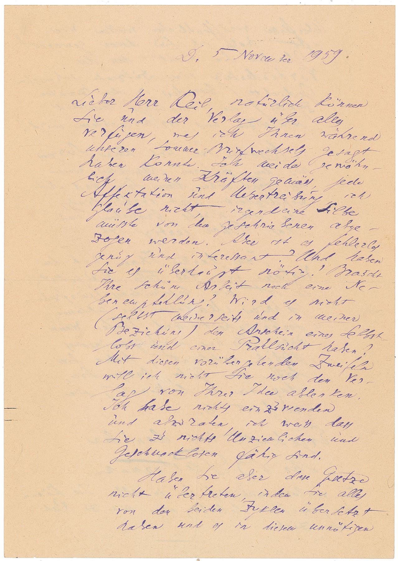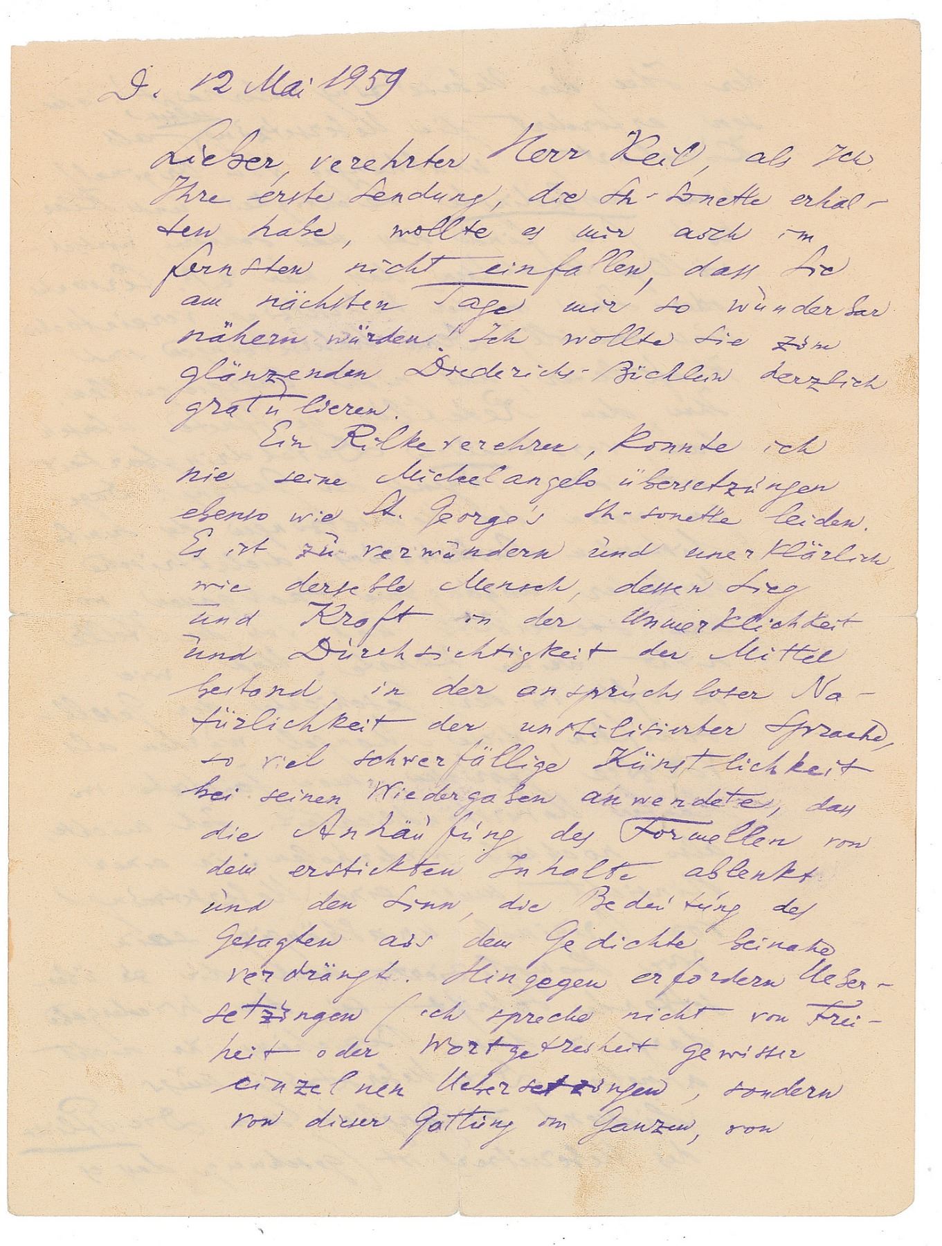 On May 12, 1959, he offers congratulations on "shiny Diedrichs booklet," and writes (translated): "A Rilke worshiper, I could never suffer his Michelangelo translations as well as St. George's Sh[akespeare] sonnet. It is too puzzling and inexplicable how the same man, whose victory and strength consisted in the imperceptibility and transparency of the means, in the undemanding naturalness of the unpretentious language, applied so much ponderous artificiality in his reproductions, that the accumulation of the formal was stifled by the stale content distracts and almost displaces the meaning, the meaning of what is said from the poem. On the other hand, translations…require unconditional ease and clarity…because translations are power conductors, and not sources of energy."