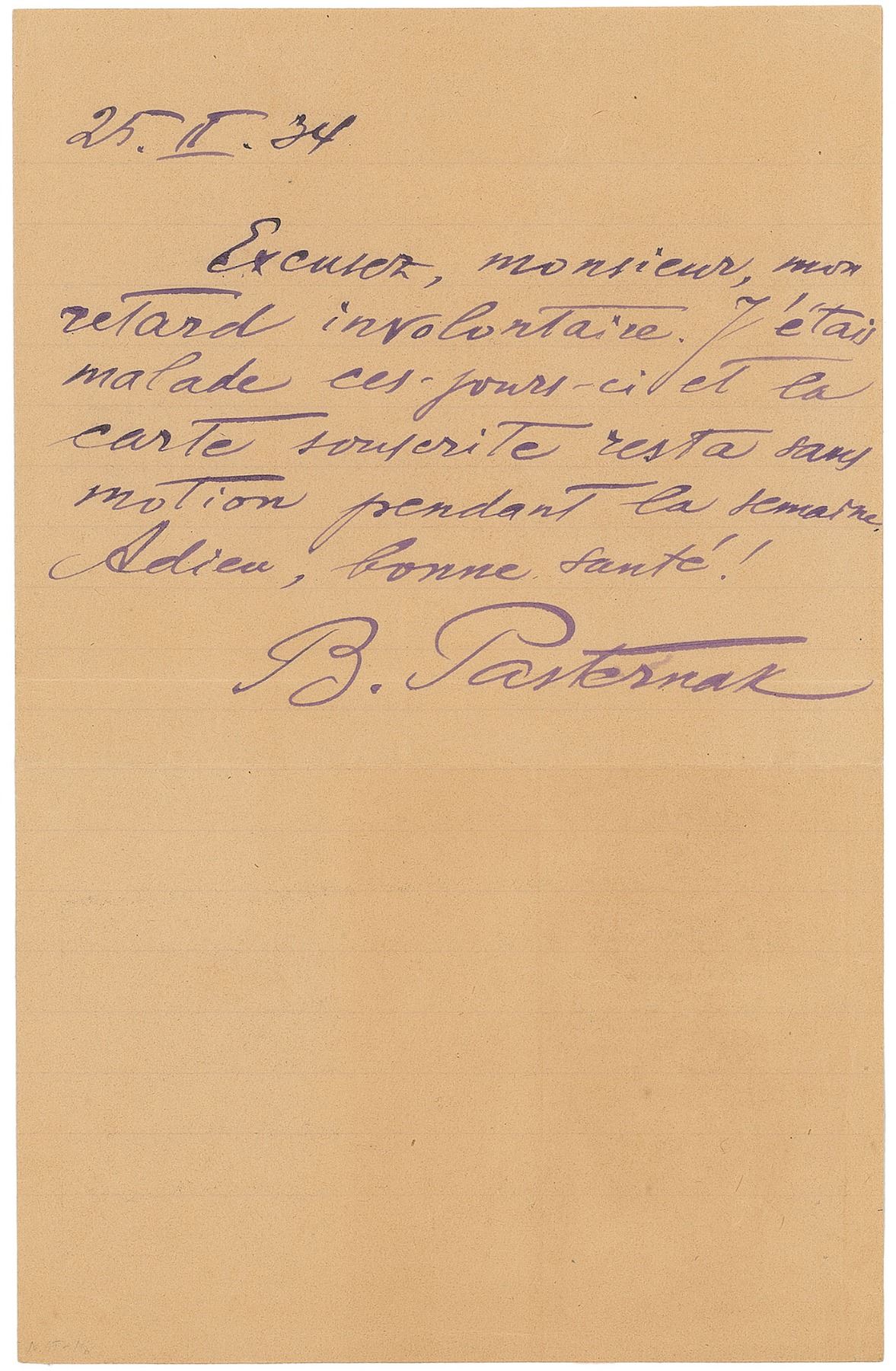 Russian writer and translator (1890–1960) whose novel Doctor Zhivago takes a place among the central works of twentieth-century literature. ALS in French, signed "B. Pasternak," one page, 5 x 8, February 25, 1934. A brief note apologizing for his delay, which was caused by illness. In fine condition.