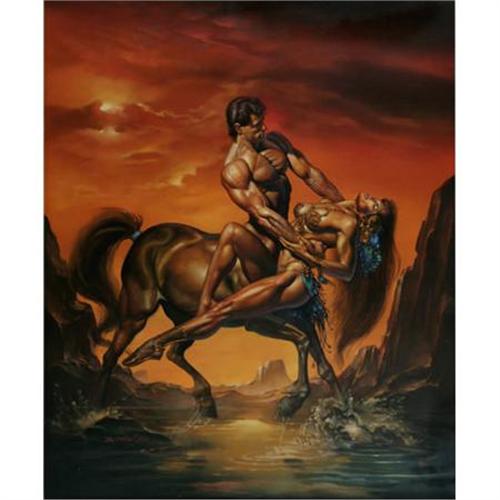 <B>Boris Vallejo - "Deijaniera and Nessus" Painting Original Art (1989). </B></I> This scene is based on ancient mythology. Herakles and Deijaneira were crossing a river when the centaur Nessus offered to carry Deijaneira across to other side. Nessus then tried to run away with her, but Herakles shot an arrow from the far bank, killing Nessus. This painting has an approximate image area of 19.5" x 23", and is in Excellent condition.<BR><BR><BR><b>Shipping:</b> Framed - without Glass, Large (<a target="_blank" href="http://www.heritageauctions.com/common/shipping.php">view shipping information</a>)